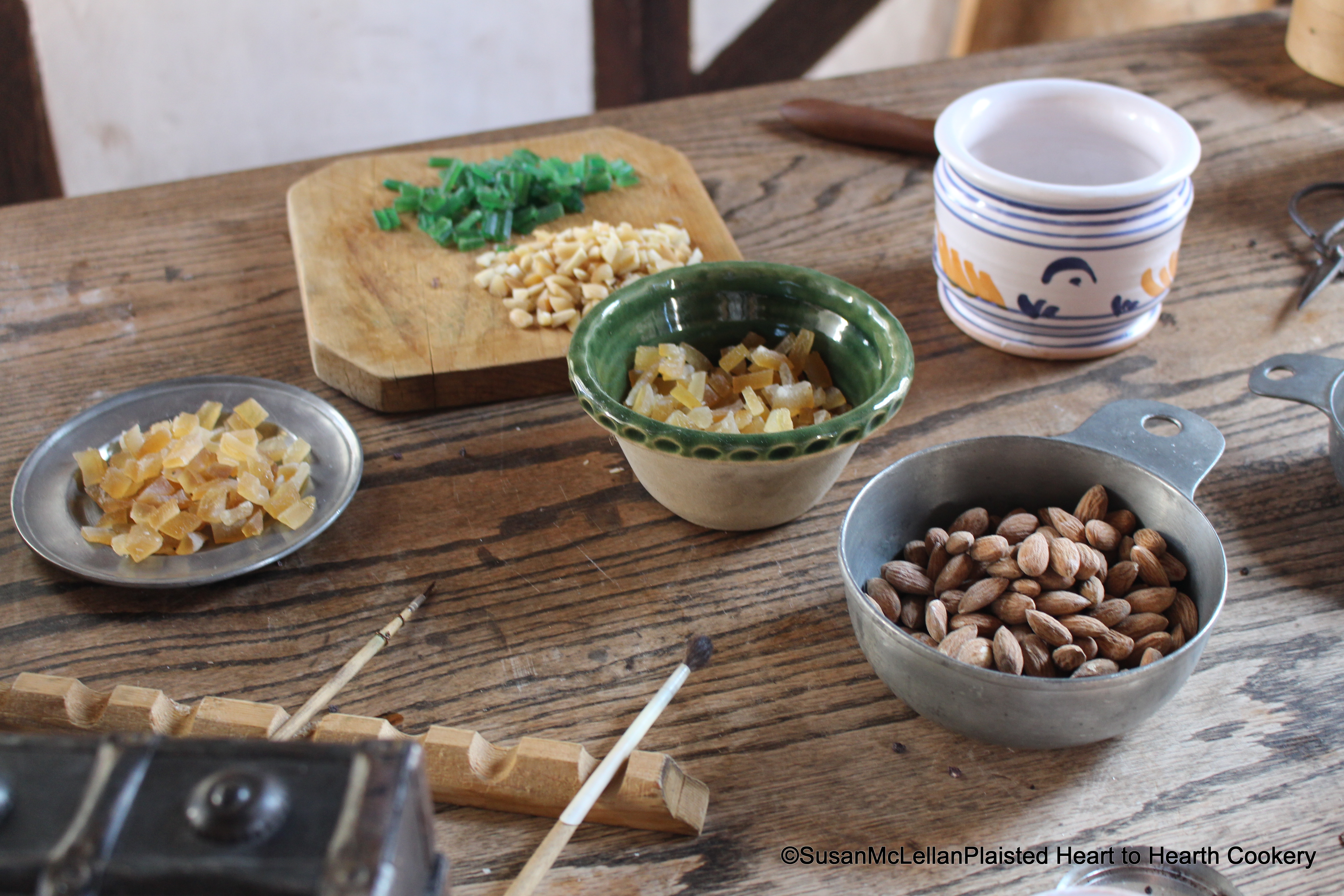 After the preserved orange peel has been cut in pieces about half an inch long, and not quite a quarter wide for the receipt (recipe) Millefruit Biscuits, then take six ounces of angelico, cut it the same way, and a quarter of a pound of preserved lemon peel, and six ounces of sweet..almonds, and let all these be cut the same way as the orange peel. Visit my website at: www.hearttohearthcookery.com