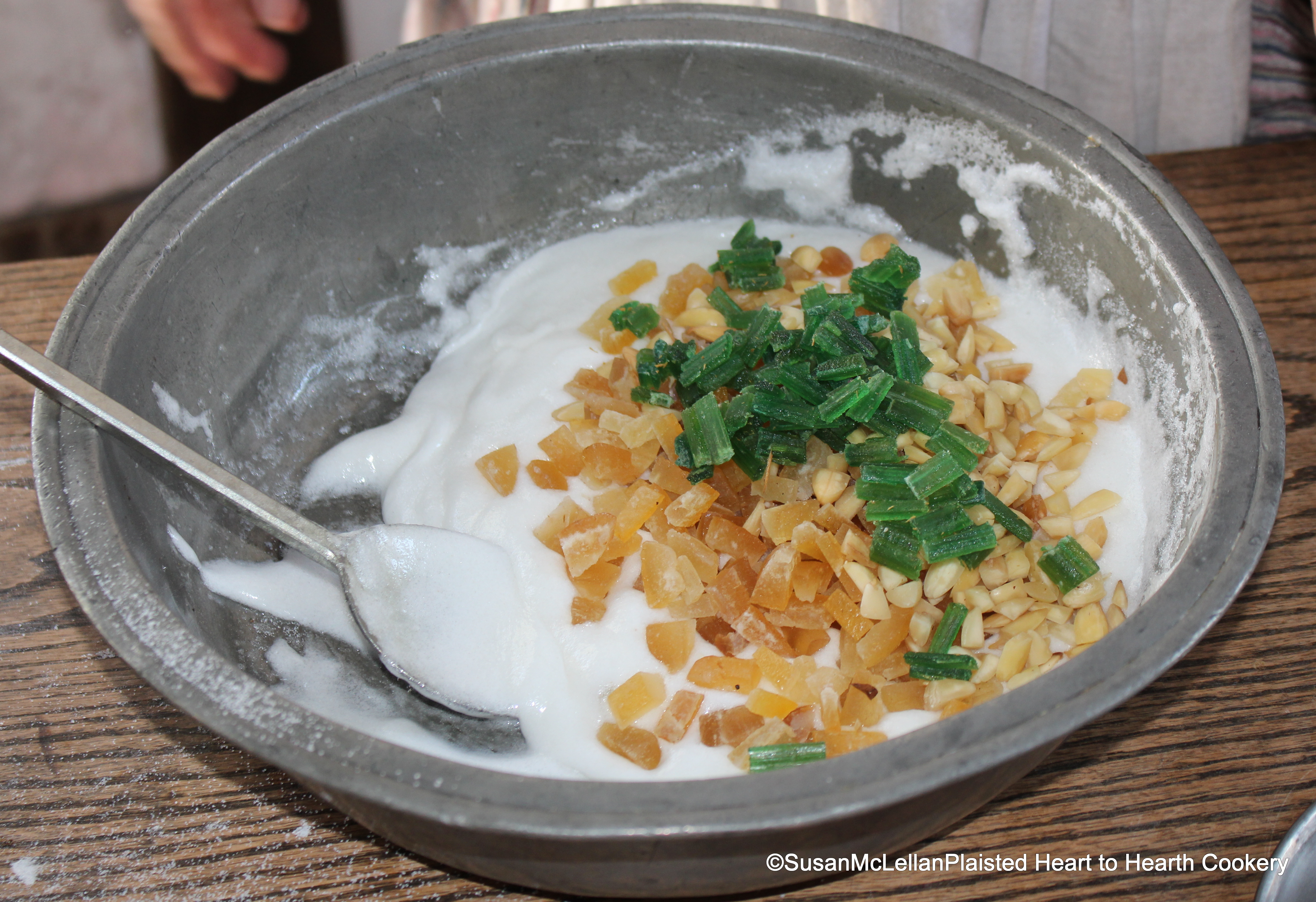 Once the iceing has been prepared for the receipt (recipe) Millefruit Biscuits, the cut pieces of preserved orange peel, angelico, preserved lemon peel and almonds are put into it.