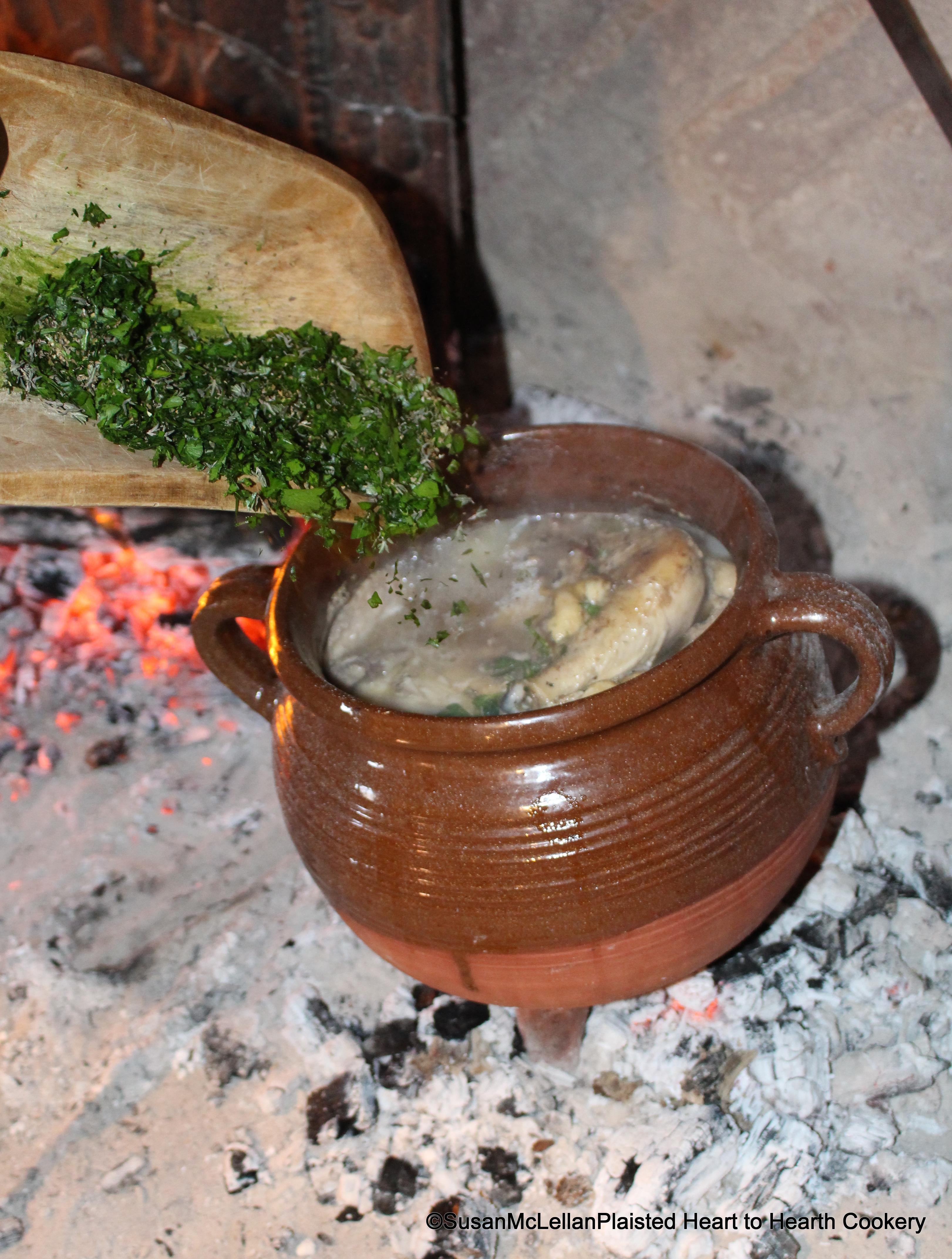 For the receipt (recipe), An exceeding good way to stew Chickens, after part of that liquor be consumed (the water), take Parsly, sweet Marjoram, with a little Thyme, and shred them very small and put them in.