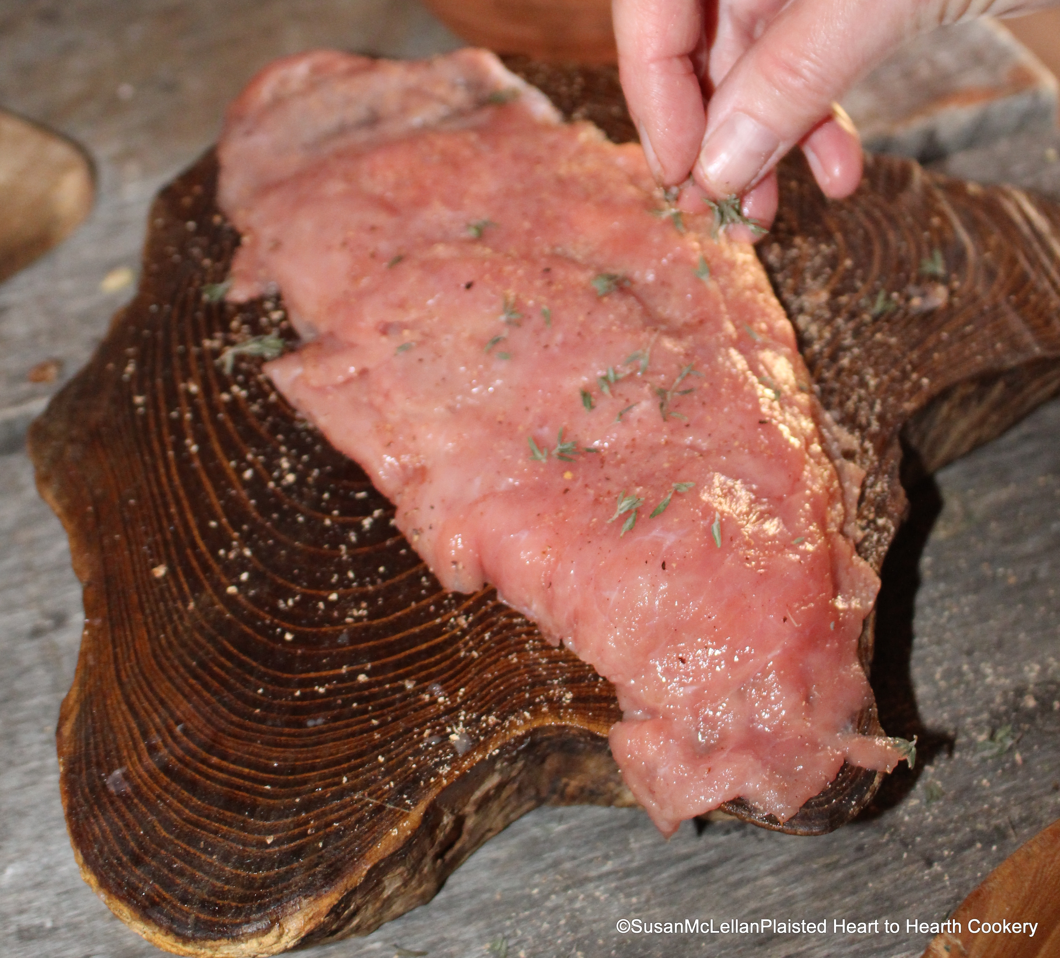 After the veal is cut in thin slices and beaten well with a rouling pin for the receipt (recipe) Frigase of Veal, the next step is to season it with Nutmeg, Lemon and Thyme.