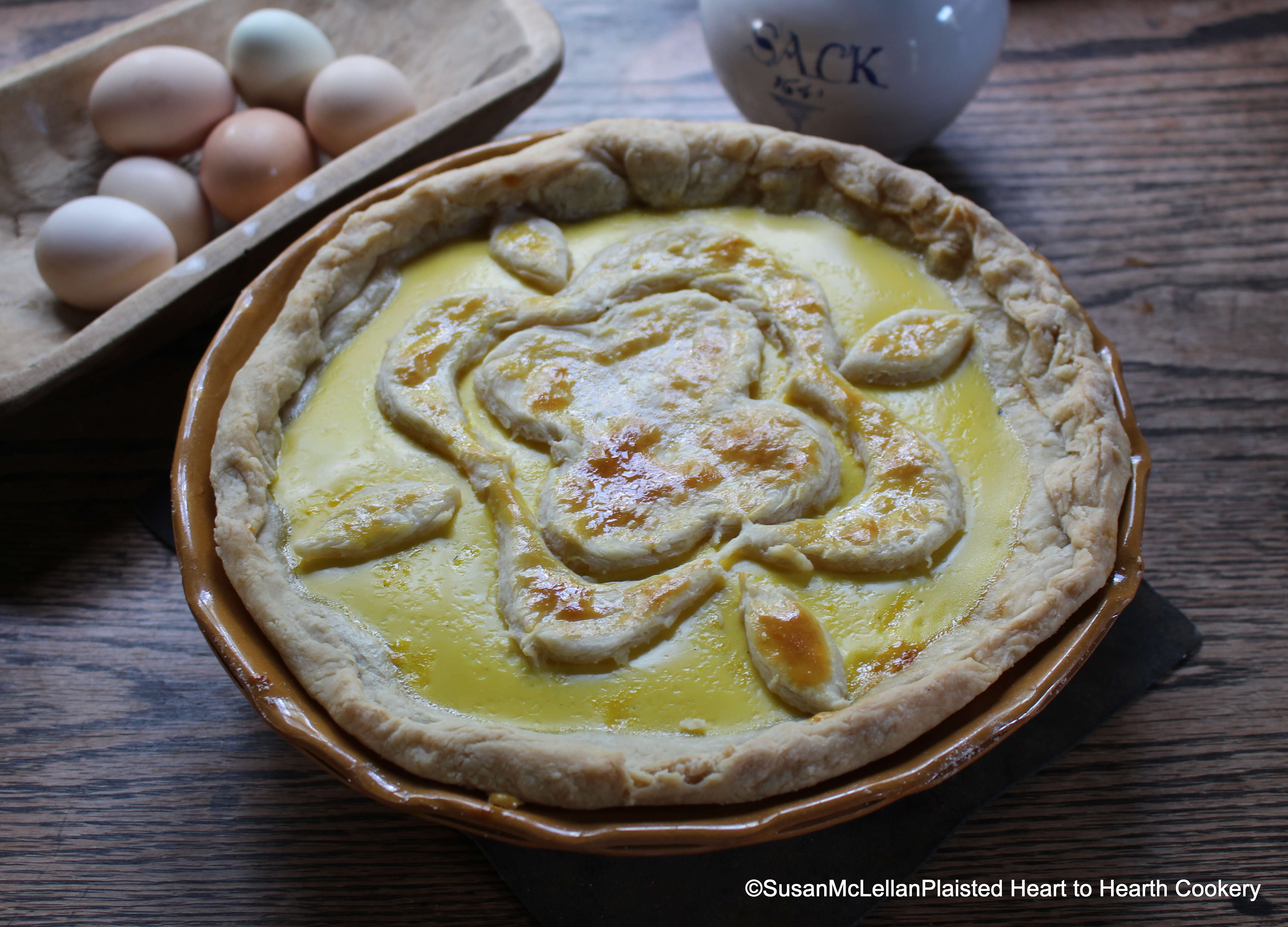 Pictured is the complete tart with form prepared from the receipt (recipe), To make yellow Tart stuffe. The ingredients are four and twenty Eggs, a quart of seething Milk, Sack and Sugar, to your taste.