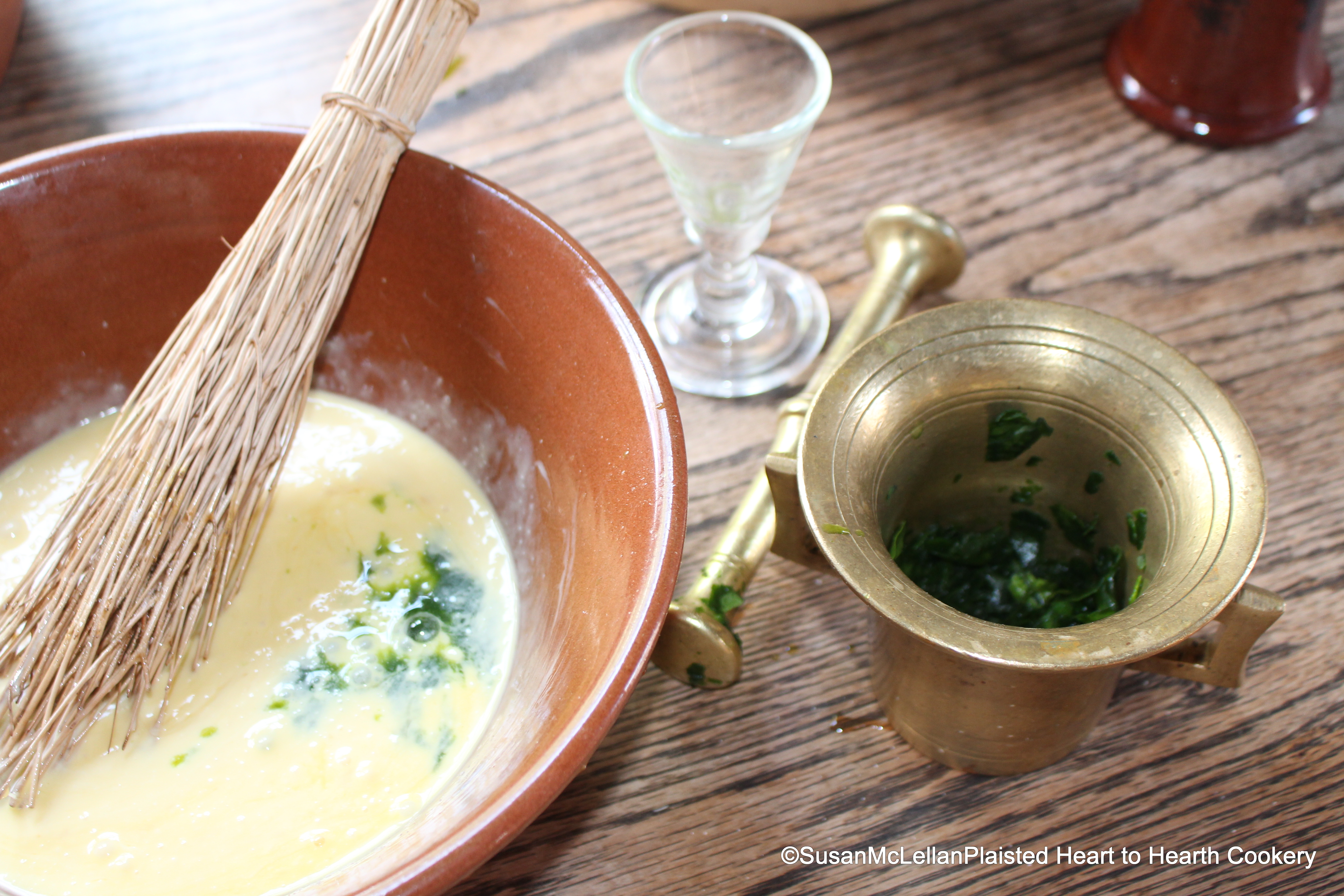 Then put in the juyce of Spinnage to make it green, to the mixture of eggs, sugar, sack and cream and beat it againe a little for the receipt (recipe), How to make a very good Tansie. The mixture will stand till you fry it.