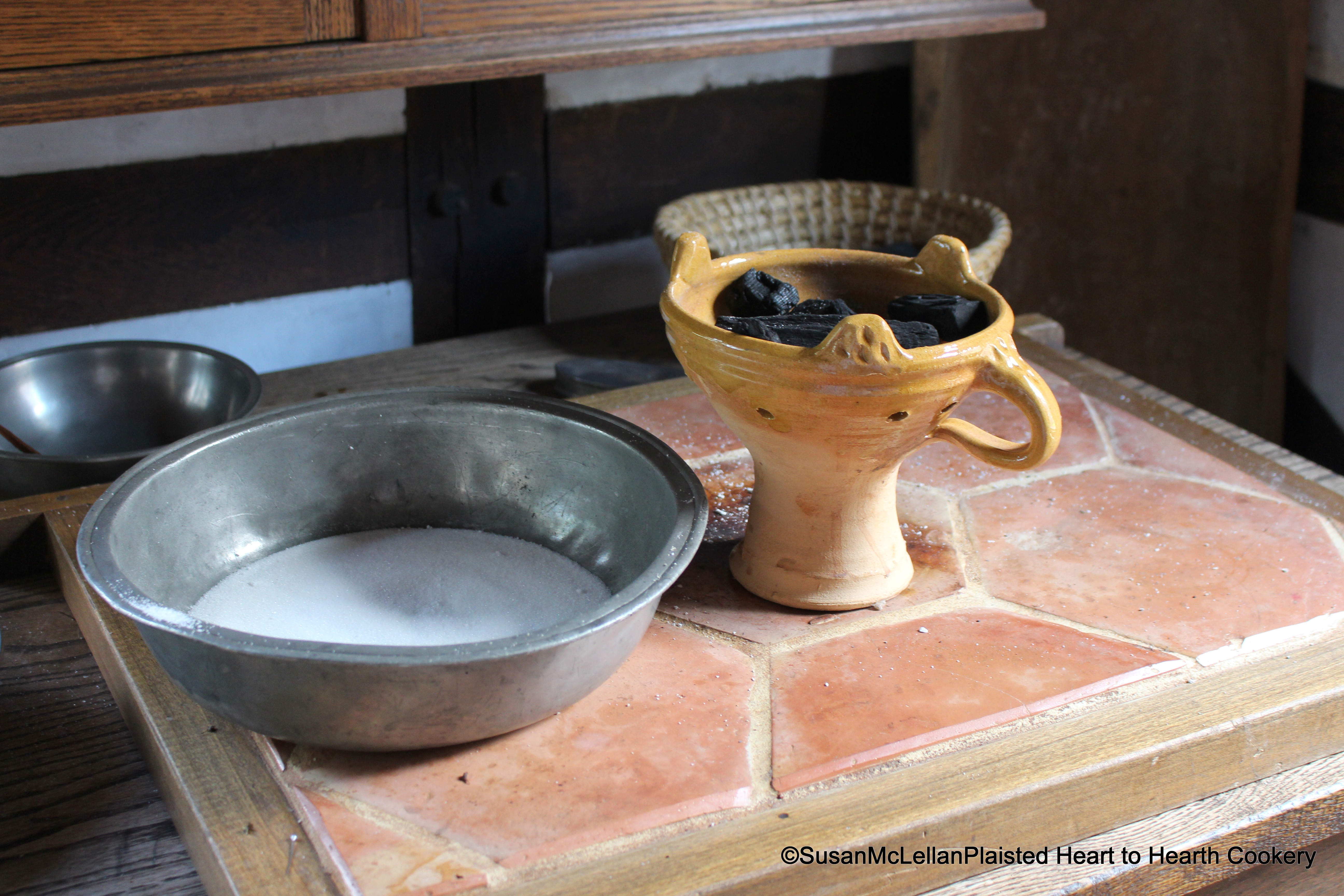 After equal weight of sugar as gooseberries has been weighed for the receipt (recipe), To preserve Gooseberries, lay the best part of the Sugar in the bottom of a silver or pewter dish. I am using a pewter basin and have laid in more than half of the sugar that was weighed. The chafing dish that I will be using is to the right of the basin.