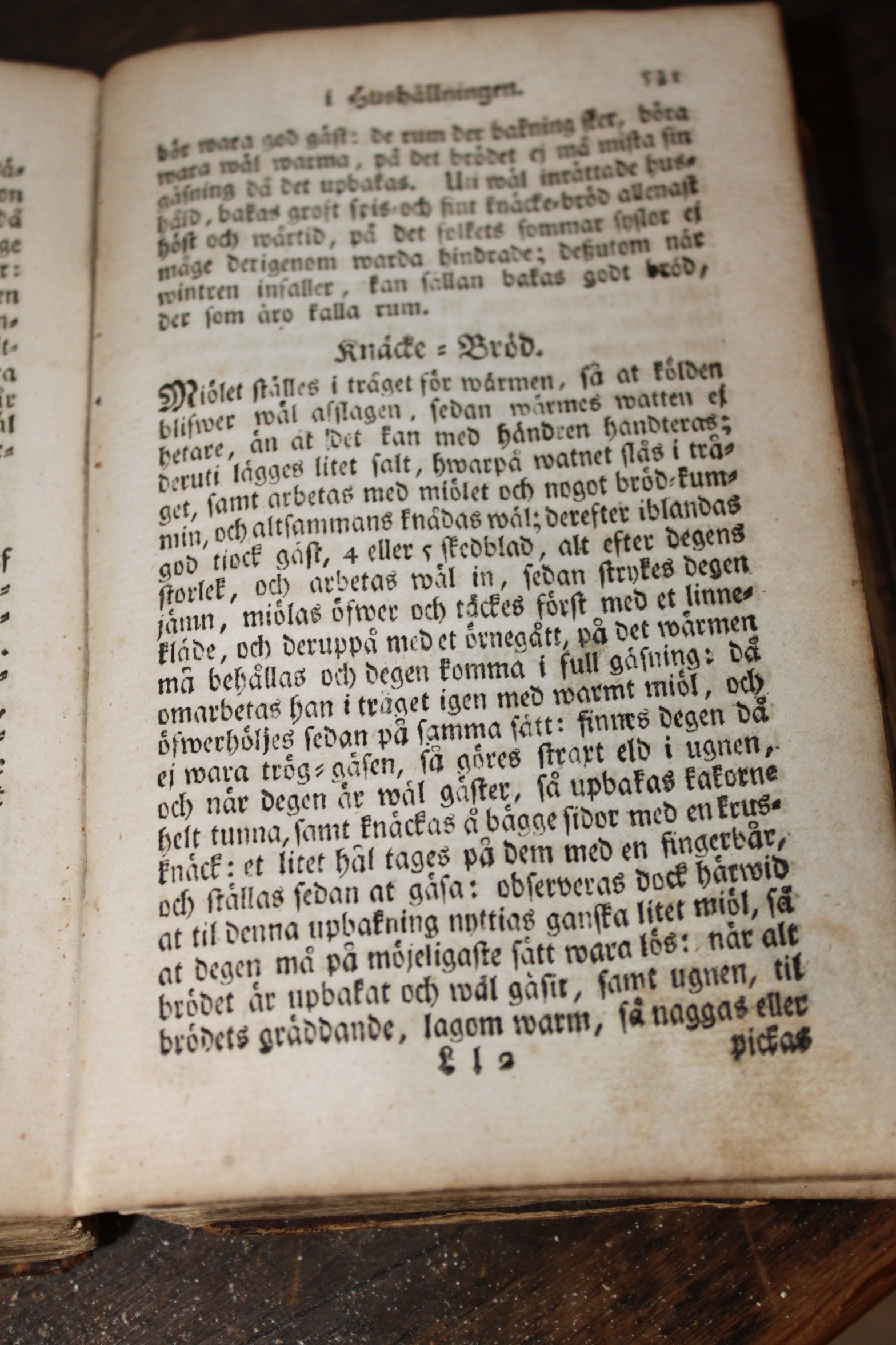 The last posts on Knäckebröd were posted on my blog in 2012. Since that time, my demonstrations have been augmented by more research, improved tools and more practice. The best research find was a receipt (recipe) for Knäckebröd in an original 18th century book written in the old Swedish.