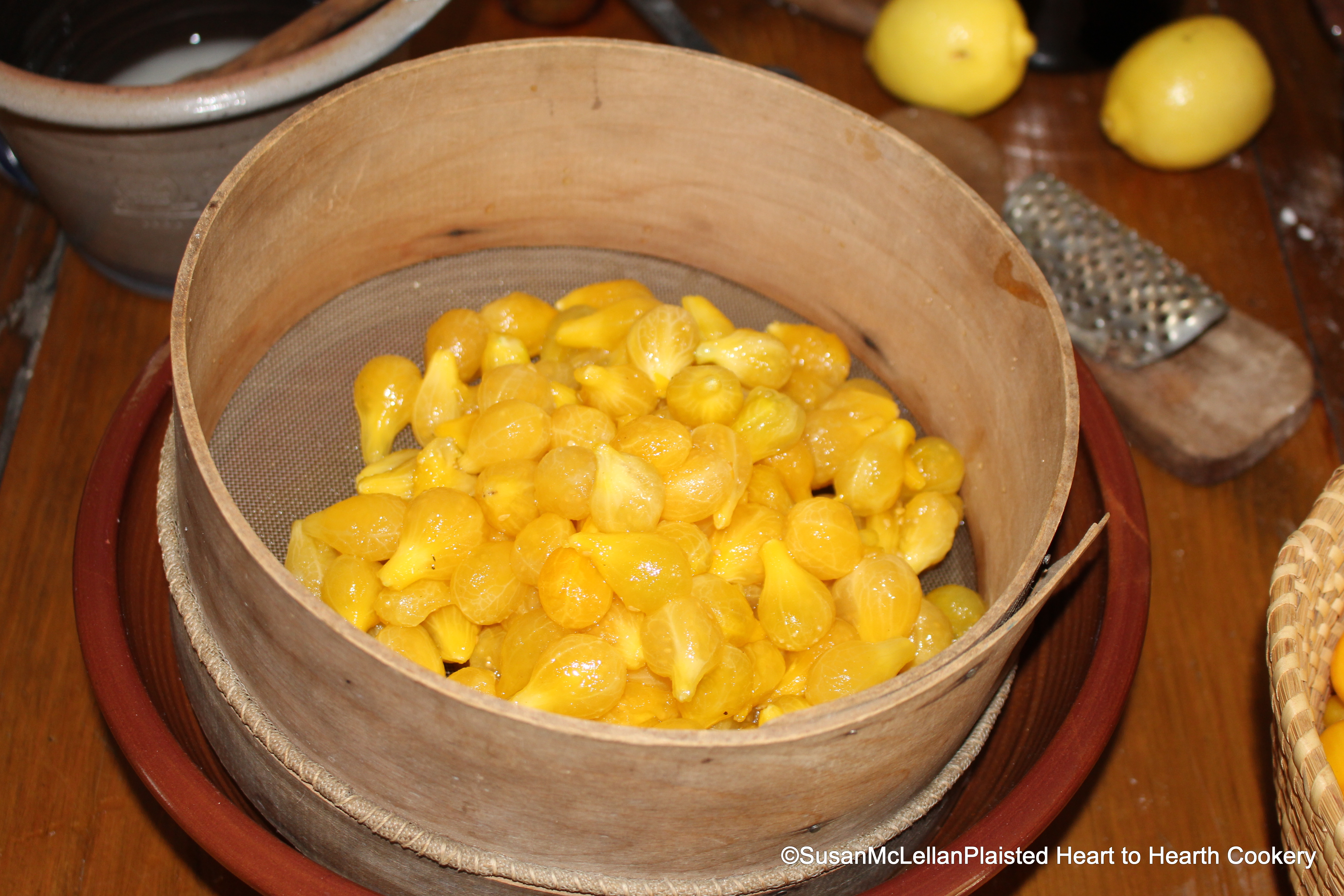 The juice that is formed from the peeled yellow pear tomatoes being layered with sugar, juice and rind of lemon, is drained from the tomatoes the next morning using a sieve in the preparation of the receipt (recipe), Tomato Preserves.