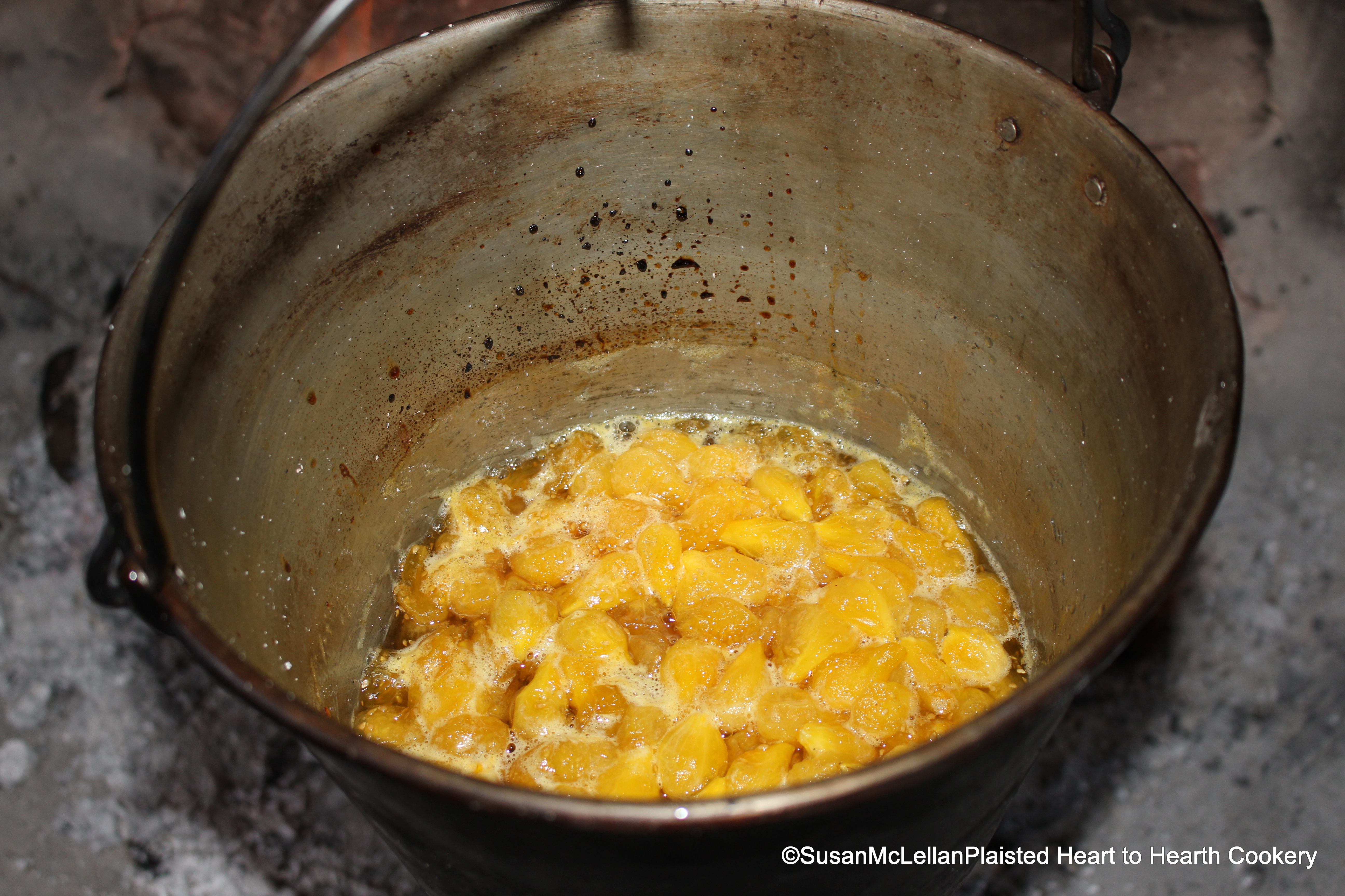 When the juice and sugar from the yellow pear tomatoes has become a thick syrup for the receipt (recipe) Tomato Preserves, boil the tomatoes until transparent.