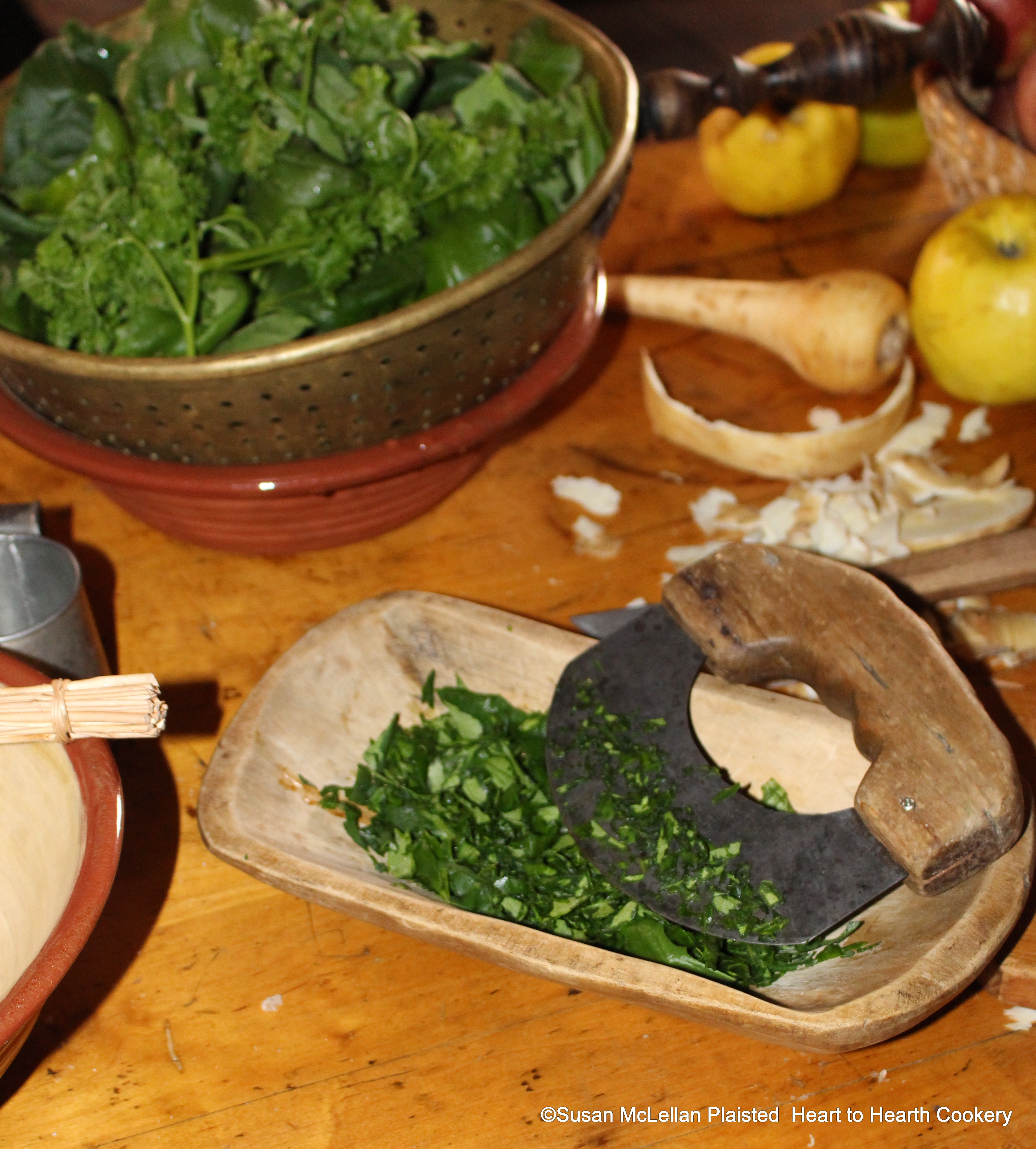 After the long pieces of parsnips have been added to the cut mutton for the Dutch receipt (recipe), To stew Mutton, the translated receipt states and furthermore all sorts of greens coarsely chopped. I used the late fall greens still in my garden, spinach and parsley.
