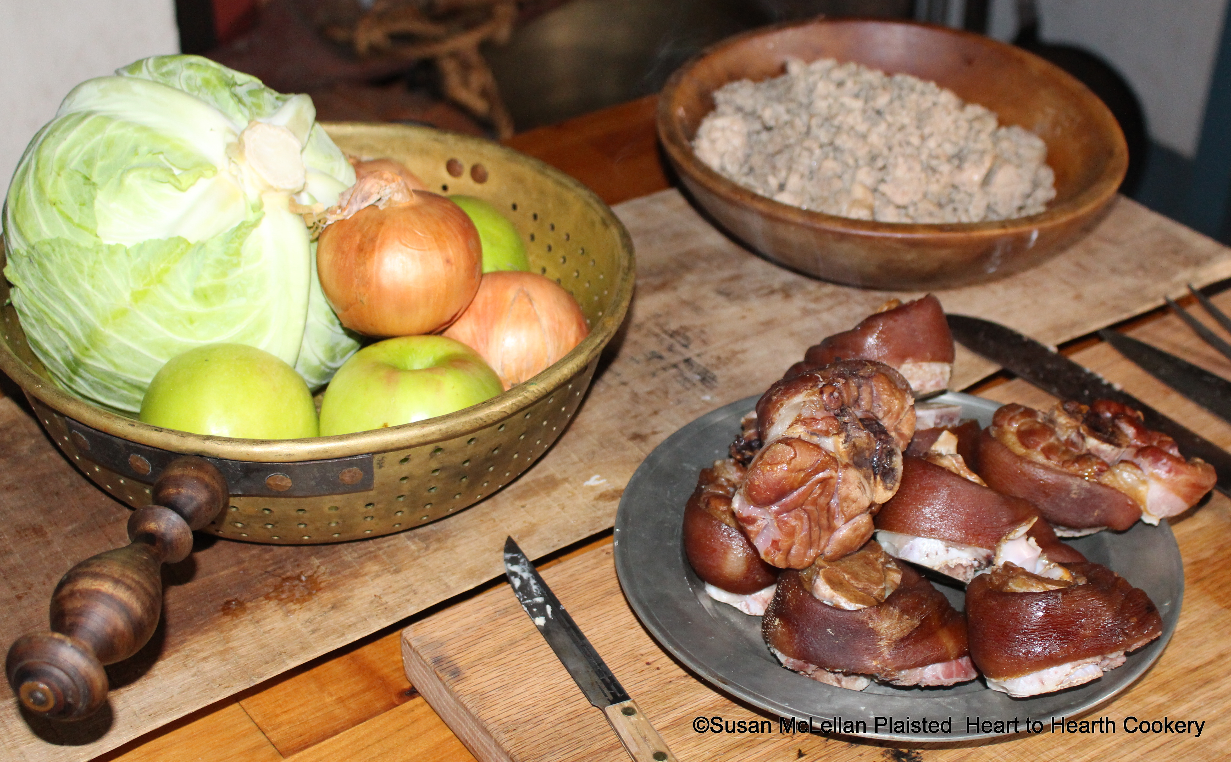 The ingredients are on the table for Gumbis which is a “mixture” having a long history in Swiss and South German cooking. The stew is made by laying cabbage, apple, onion and a meat (typically ham, sausage or bacon. In this Gumbis both ham hocks and sausage were used.