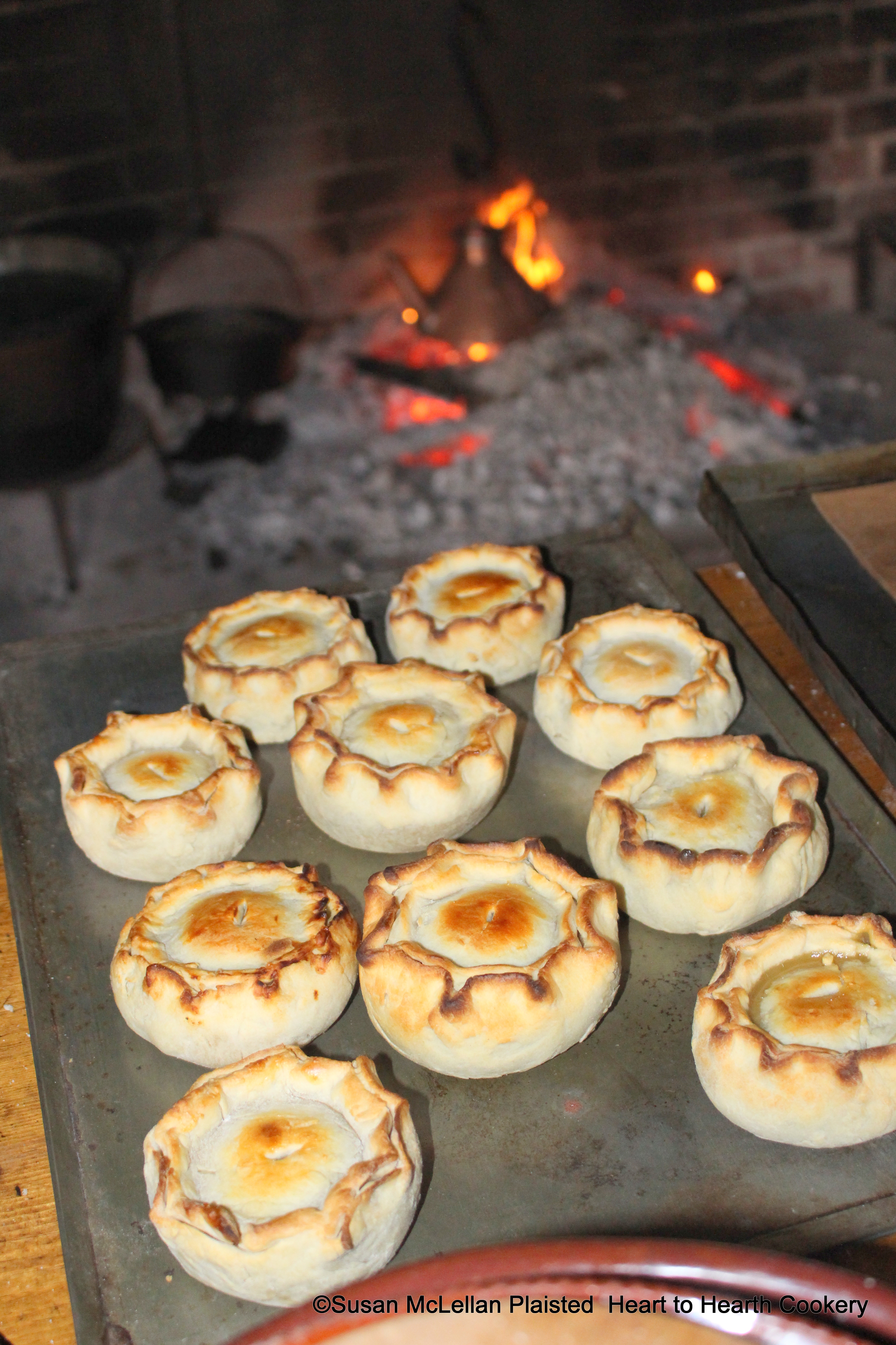 The Chewitts, filled with the receipt (recipe), To make Minced Pies of Beef, browned nicely in the quick (hot) bake oven.   They are cooling on the tin baking sheet.