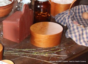The date was April 1 but inside the cabin for the Shaker Your Plate program it was March 1 and Mother Ann’s birthday was being celebrated. Mother Ann was born February 29, 1736. The original receipt (recipe) for Mother Ann’s Birthday Cake reads: “Cut a handful of peach twigs, which are filled with sap at this time of year. Clip the ends and bruise them and beat cake batter with them. This will impart a delicate peach flavor to the cake.” My bruised peach twigs are pictured on the table.