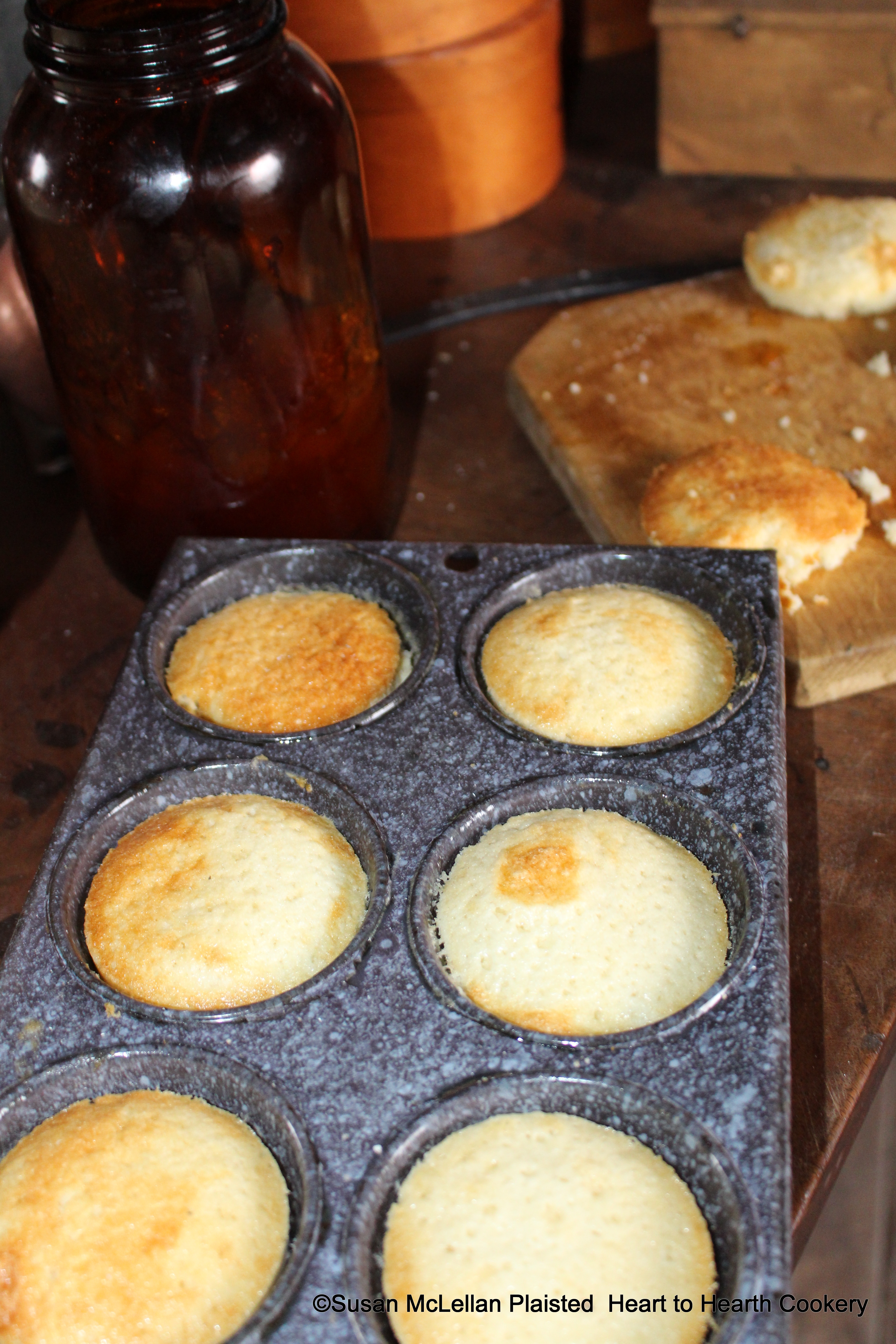 Because a tin baker relying on reflective heat from the fire was used to bake the Shaker receipt (recipe), Mother Ann’s Birthday Cake, the graniteware pan has to be turned to try to obtain an even browning.