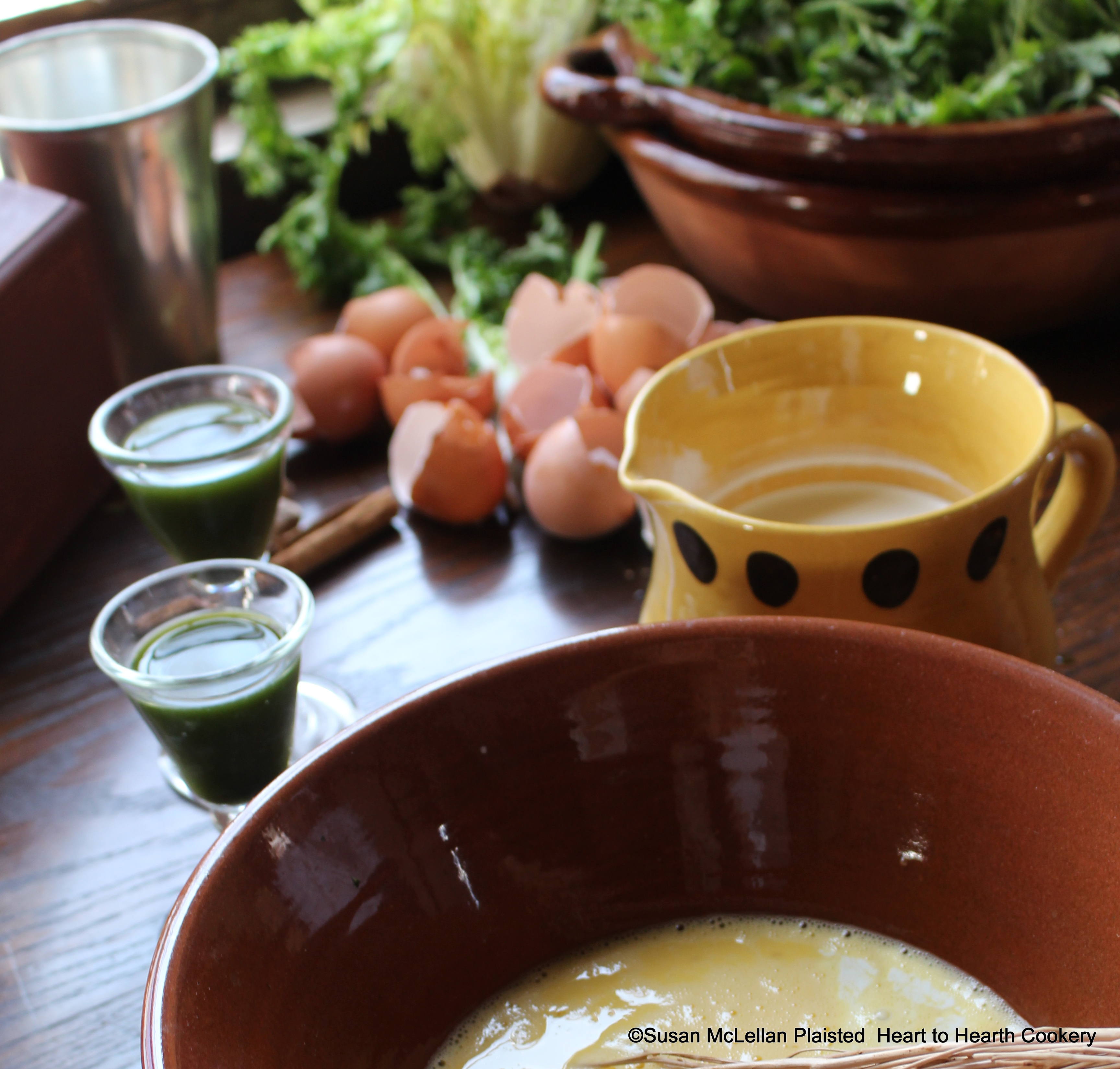 After the eggs and cream have been beaten exceedingly together for the receipt (recipe), To make the best tansy; then take of green wheat blades, violet leaves, strawberry leaves, spinach and succory, of each a like quantity; chop and beat these very well, and then strain out the juice.
