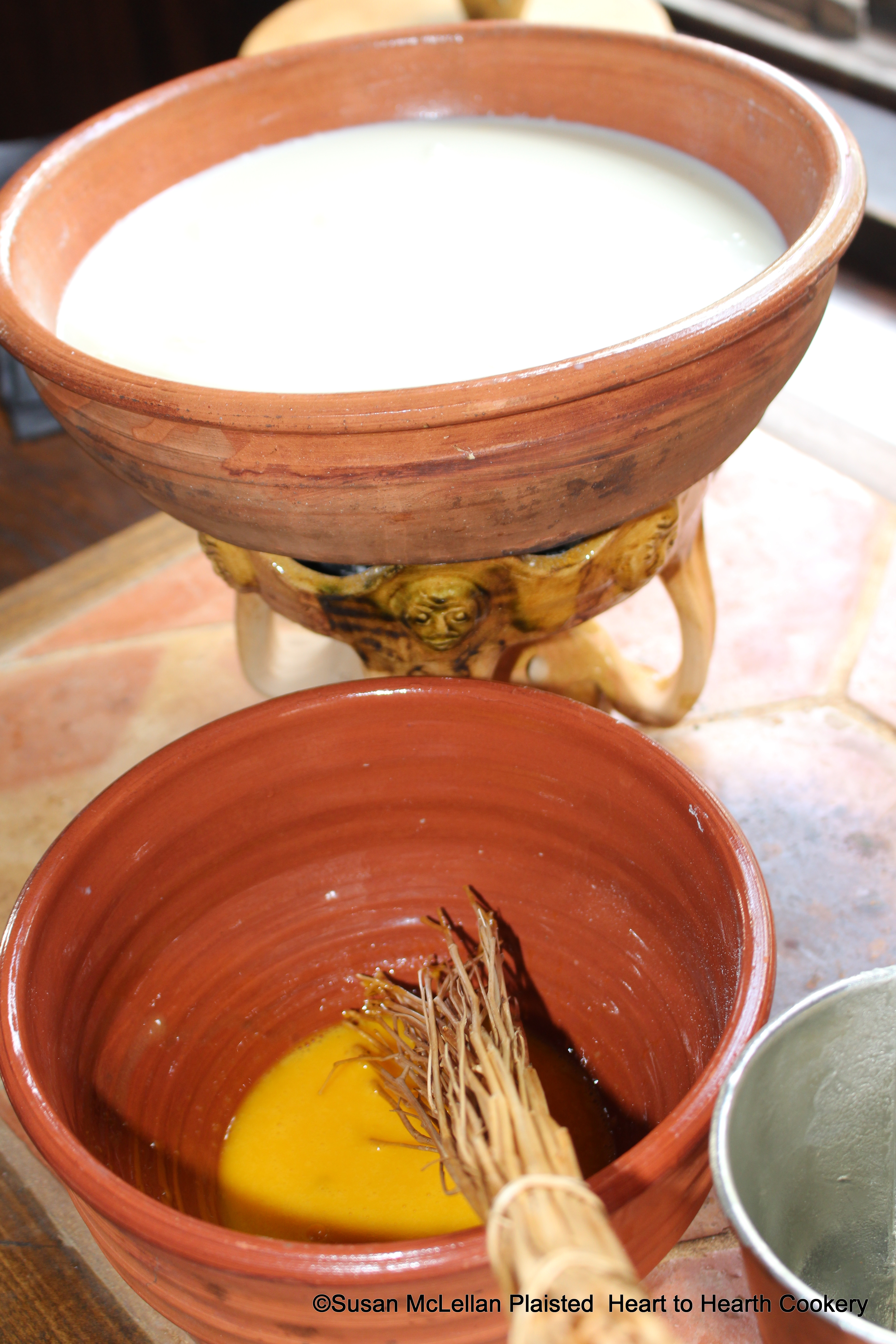 For the 16th century receipt, To make Cast Cream, take milk as it commeth from the cow, a quart or less and put thereto raw yolks of eggs. The raw milk is in a redware baking dish sitting on my chafing dish.