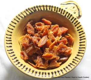 Pictured is the finished product of the receipt (recipe), Too Dry Apricocks. The apricots were stoned, heated thoroughly in a syrup, drained and dried in the sun. The result is unbelievable as it is the best apricot fruit leather that I have ever tasted!