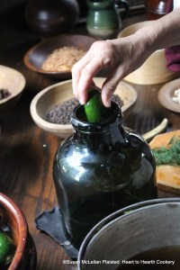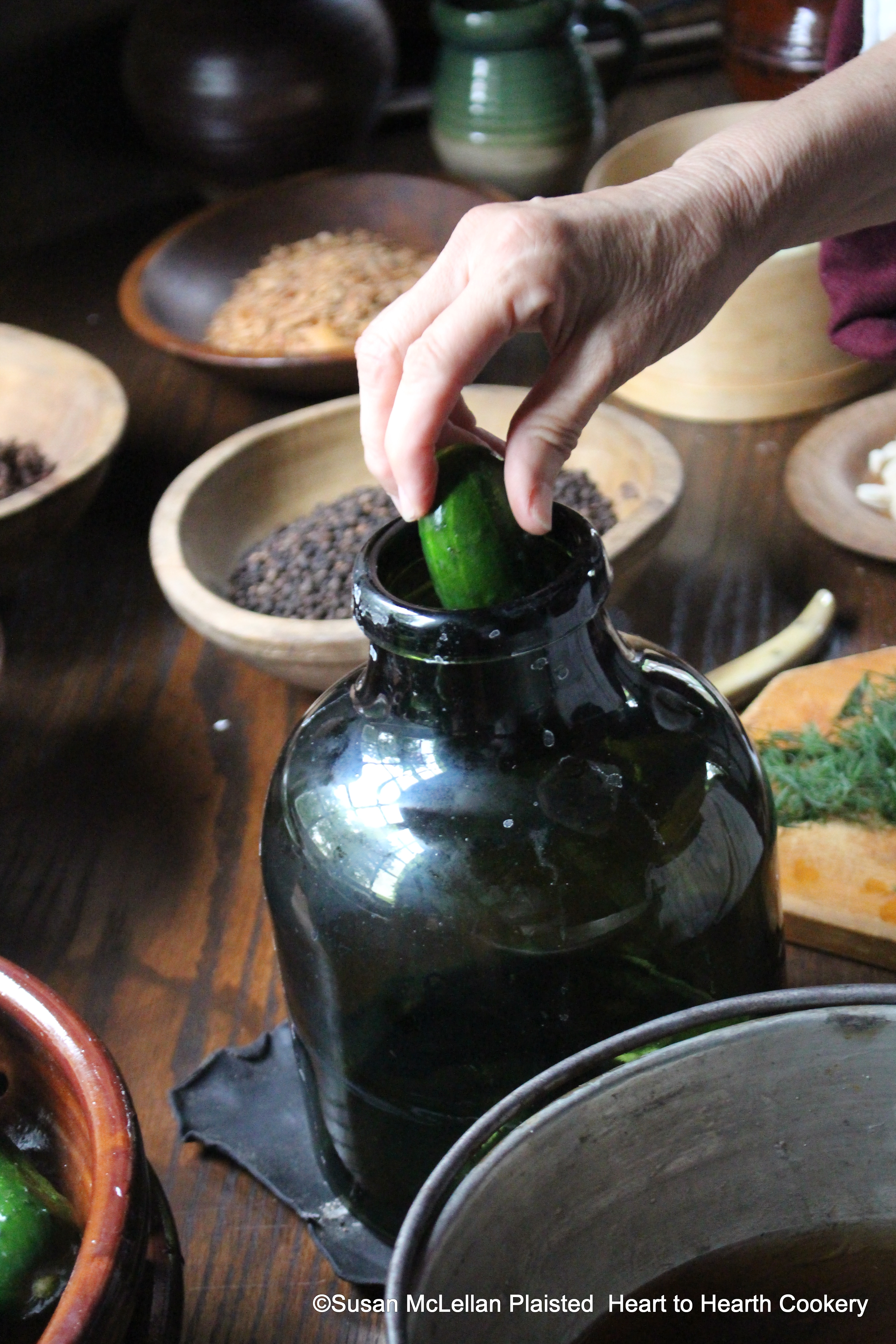 After the Cucumbers have been well drained in an earthenware colander for the receipt (recipe). To pickle small Cucumbers which are delicious, put them in a Bottle or gray earthenware Pot. I chose to use a hand-blown glass bottle for the pickles.