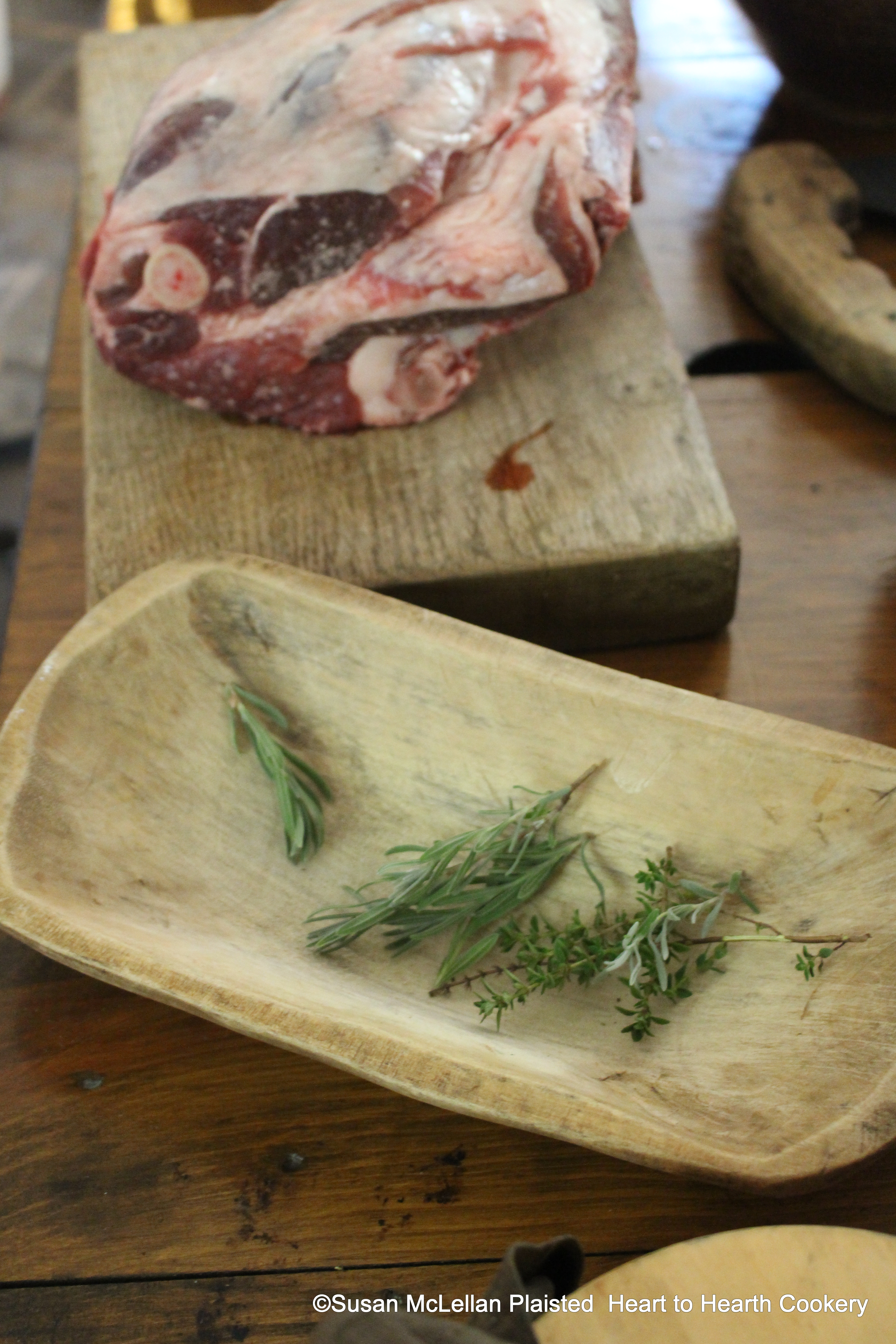 The first step for the receipt (recipe), To dress a Shoulder of Mutton is to stuff it with sweet Herbs. Pictured is thyme and rosemary to be prepared with a rocker knife and then stuffed between the muscles of the shoulder.