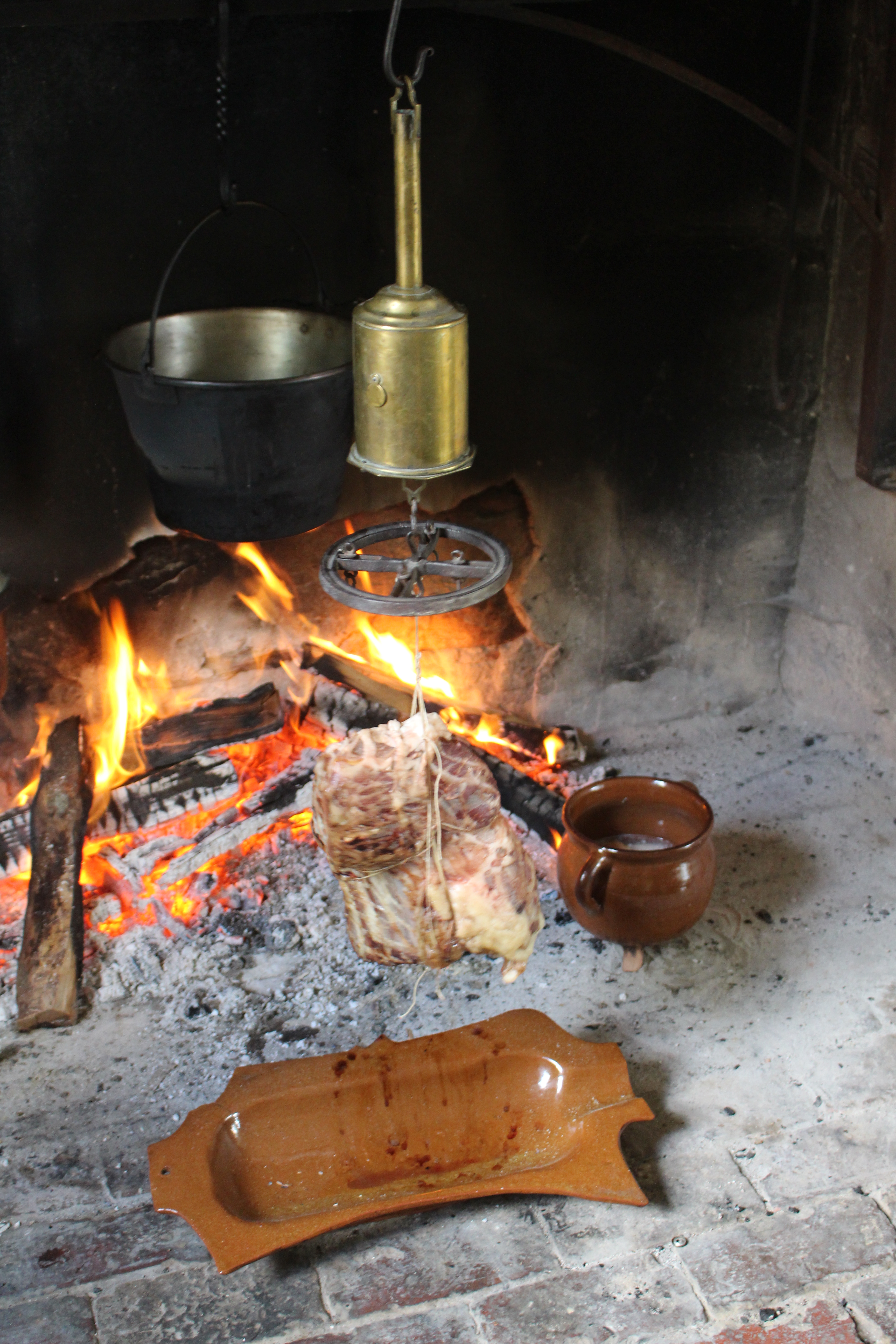 The bottle jack (named for its shape) was a mechanical method for spinning roasts slowly in front of the fire, first in one direction and then stopping and rotating the opposite direction. It emulates the more common and practical roasting on a string