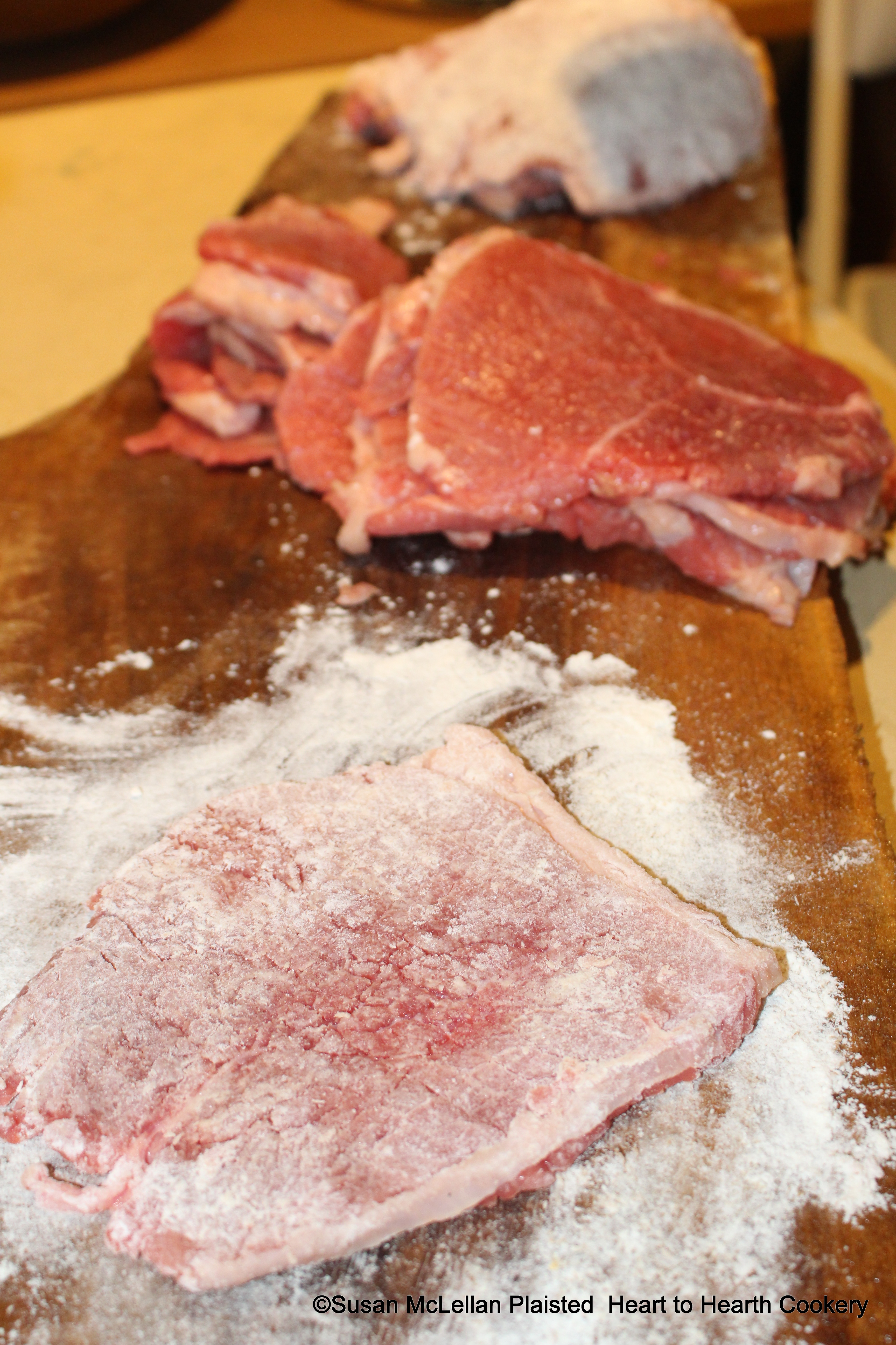 For the receipt (recipe), Staffordshire Beef Steaks, after the steaks have been cut-beat them a little with a rolling pin, flour and season them.