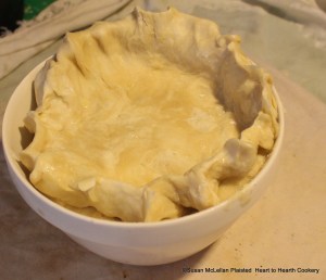 After a paste has been laid in a basin and the rollers of steaks placed in for the receipt (recipe), Beef-steak Pudding, cover the basin with a paste, and pinch the edges to keep the gravy in.