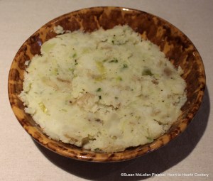 The receipt (recipe), Cale-Cannon, a dish of potatoes mashed and minced cabbage, is served to table in a Rockingham serving dish.
