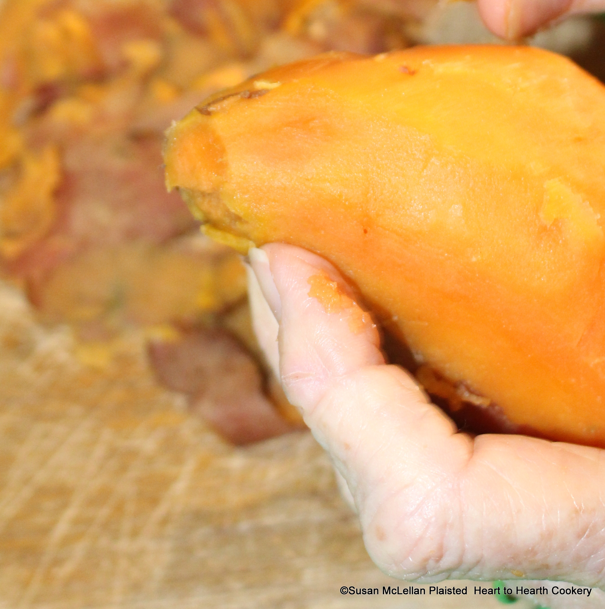 After the sweet potatoes have been parboiled until half done for the receipt (recipe), Sweet Potato Pudding, peel them, and when cold grate them.