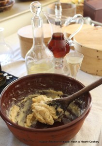 After grating sweet potatoes for the receipt (recipe), Sweet Potato Pudding, stir together to a cram, half a pound of butter and a quarter of a pound and two ounces of powdered sugar, add a grated nutmeg, a large tea-spoonful of powdered cinnamon, and half a tea-spoonful of beaten mace.  Also the juice and grated peel of a lemon, a wine glass of rose water, a glass of wine, and a glass of brandy and stir all well together.