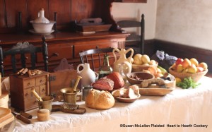 This is the picturesque ingredient table for my January 13, 2018 Winter Hearth Cooking Class for the receipts (recipes): To make Onion Soup the Spanish Way, A Ragoo of Celery and Ham, To make Potato Pye, Red Cabbage dressed the Dutch Way, and To stew Pears in a Sauce Pan. My next hearth cooking class (with openings) is March 24, 2018.