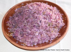 The red cabbage for the receipt (recipe), Red Cabbage dressed after the Dutch Way, is cut small, boiled, drained and simmered with oil, butter, a little water and vinegar, an onion cut small and seasoned with pepper and salt. It is now ready for table.