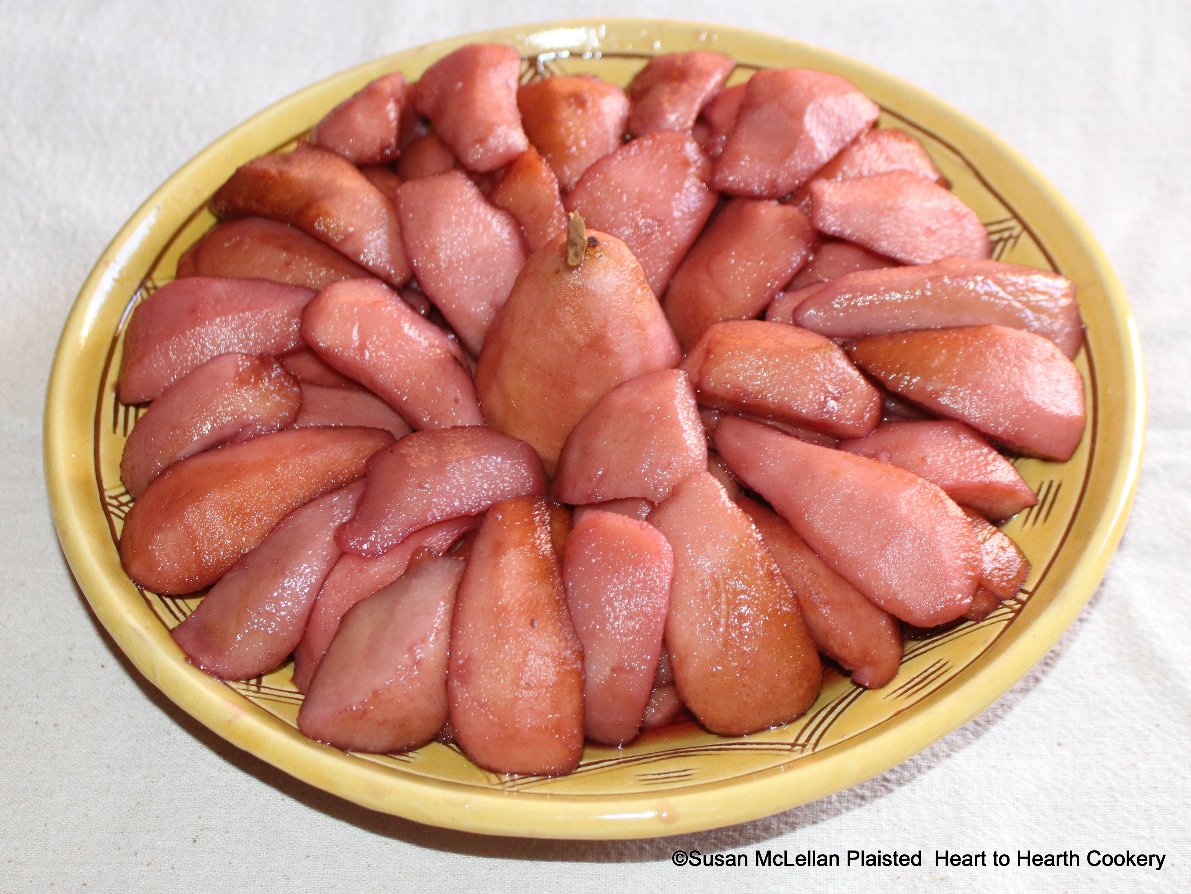 The receipt (recipe), To stew Pears in a Sauce-Pan, makes a pretty dish with one whole, the rest cut in quarters, and the cores taken out.   These pears were stewed with a few cloves, a piece of lemon-peel, a gill of red wine, and a quarter of a pound of fine sugar.