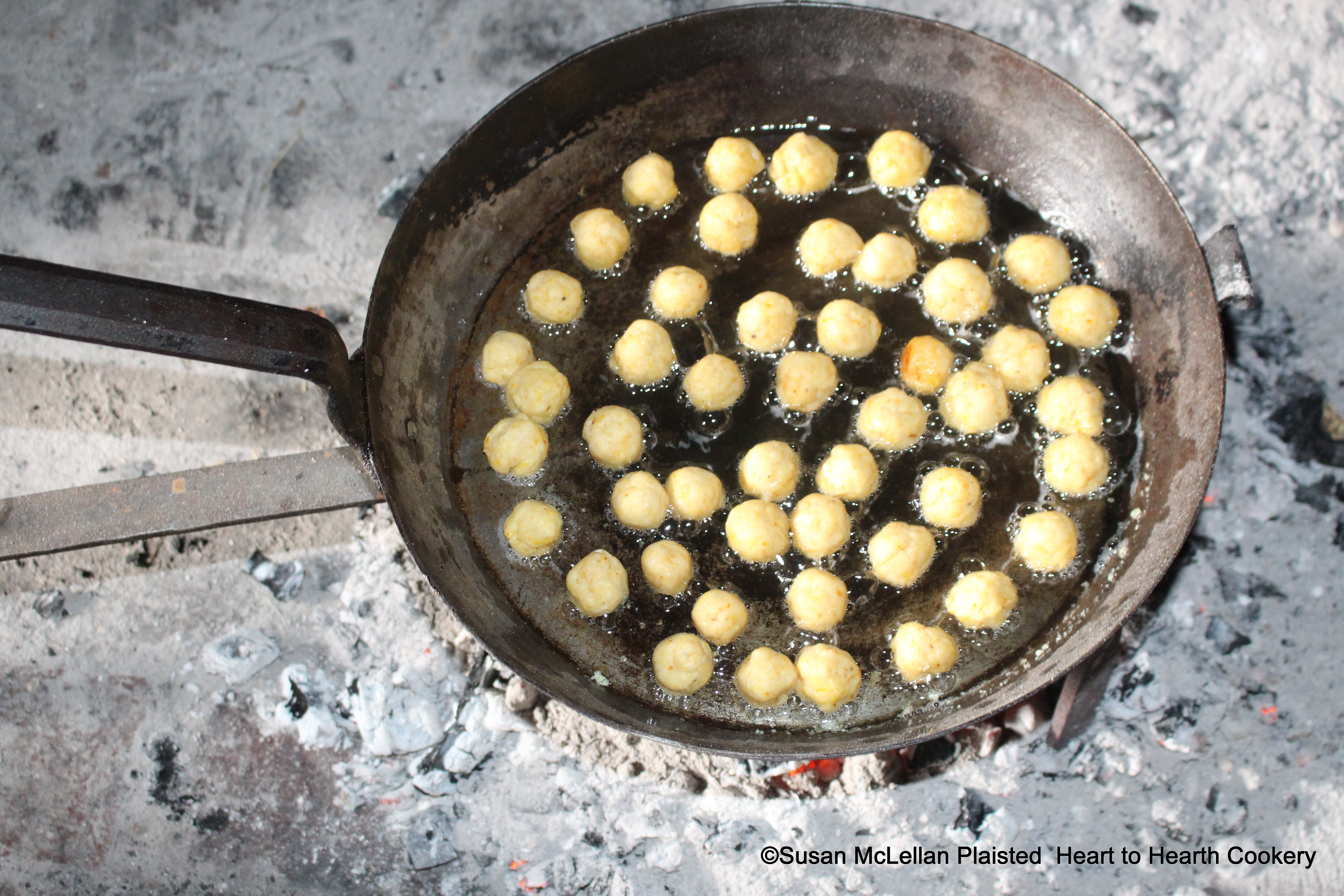 After all the ingredients (Parmesan cheese, fine flower, bisket bread beaten to a powder, yolks of eggs, saffron, rosewater, sugar, cloves, mace and cream for the receipt (recipe), Fritters in the Italian Fashion, were mixed to make it into stiff paste; and made into balls as big as a nutmeg or musket bullet, the balls (bullets) were fried in clarified butter.