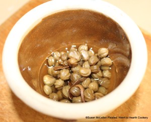 For the receipt (recipe), To dress Beef Callops, the next ingredient after the pickled cucumbers sliced thin were a few capers. What was used instead of actual capers was “poor man’s capers”- pickled nasturtium seeds. The receipt’s name is To pickle Stertion Buds but it is actually the new forming seed after the flower is spent that is harvested. Take new Stertion seeds, pickle them when large, have ready Vinegar, with what Spice you please, throw them in, and stop the Bottle close.