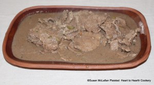 The beef for the receipt (recipe), To dress Beef Collops, is cut thin, hashed with a knife, fried in butter and stewed in a pint of gravy with red wine, pepper, salt, pickled cucumbers cut thin, a few capers (pickled nasturtium seeds) and a little onion and served to table.