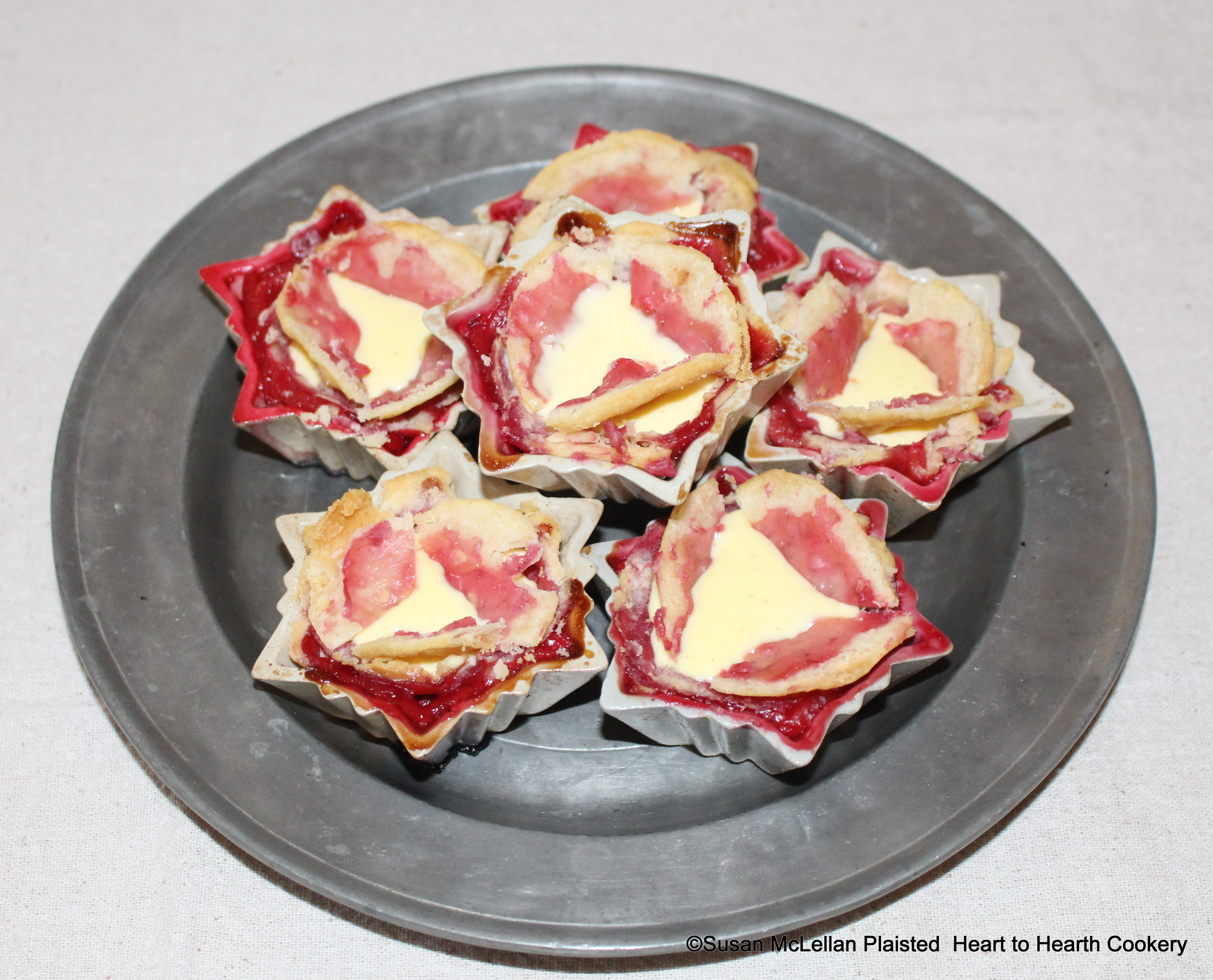 After the baking lids are removed, the cream is poured over the baked raspberries. The puff-paste baking lids are cut into little three-corner pieces and stuck in the tarts. Pictured is the completed receipt (recipe), A Raspberry Tart with Cream as it is ready to send to table cold