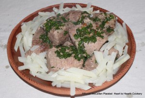 After the Beef is stewed with Ginger and Mace until done for the receipt (recipe), To stew a Beef hutspot in the Brabant manner, take some of the broth, cook it with chiopped Parsley and Butter, pour it all over.