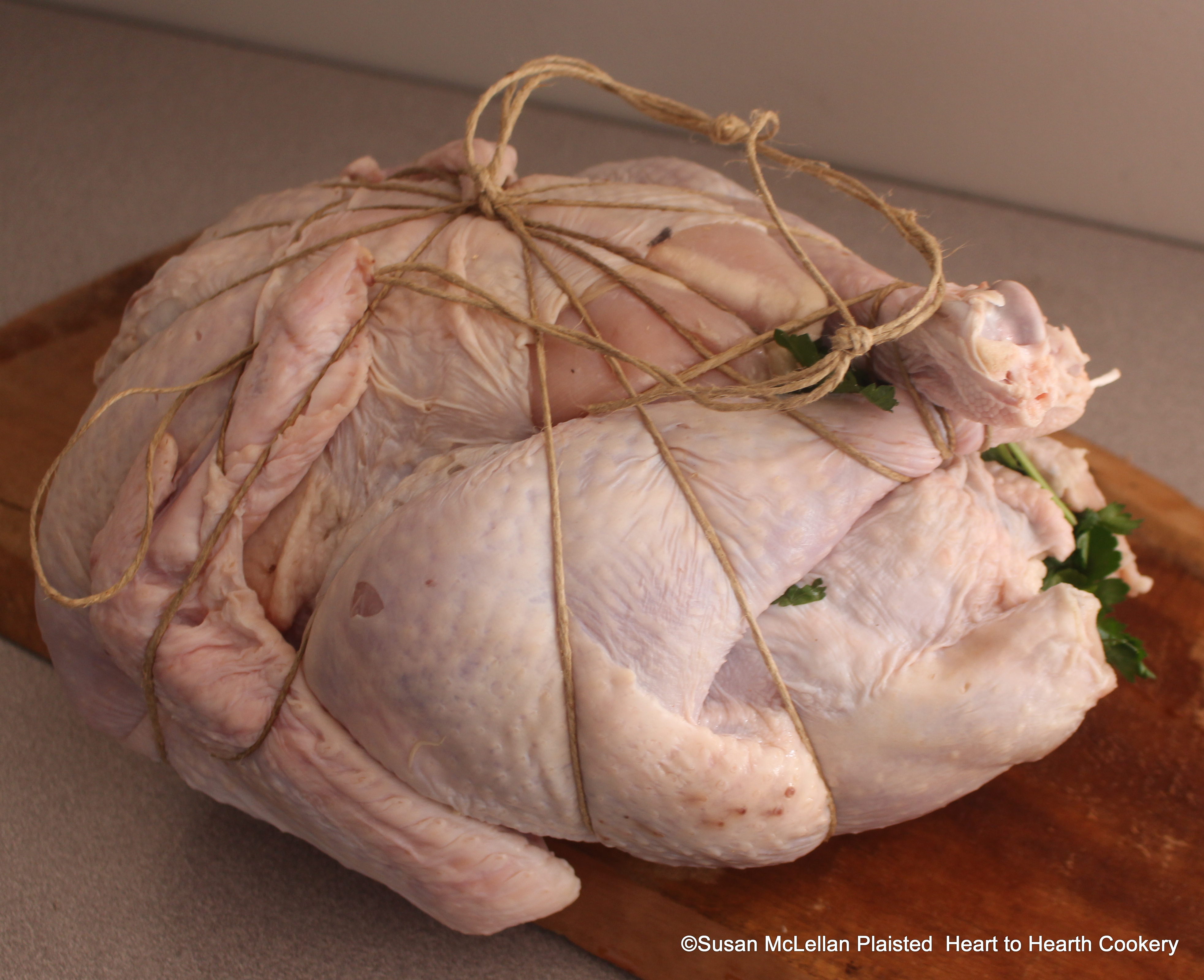 After filling the turkey with parsley for the receipt (recipe), To nicely cook Turkey, the next step is to boil only with Salt and Water until done. In order to facilitate the removal of the done turkey from the kettle and contain the parsley, the turkey was tied well with a loop for the hook.