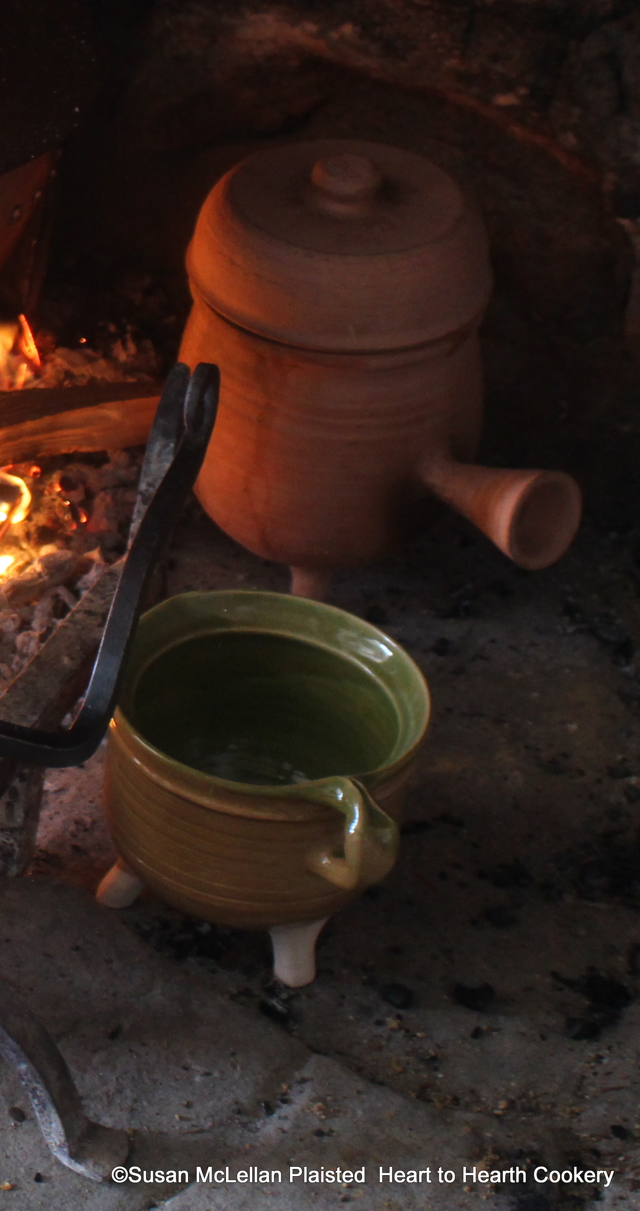 While the turkey is boiling crammed full with parsley for the Dutch receipt (recipe), To nicely cook Turkey, take an earthenware pot, pour in some Verjuice and Salt and Butter. The verjuice (prepared from unripe grapes), salt, and butter melting is in the earthenware green pipkin.