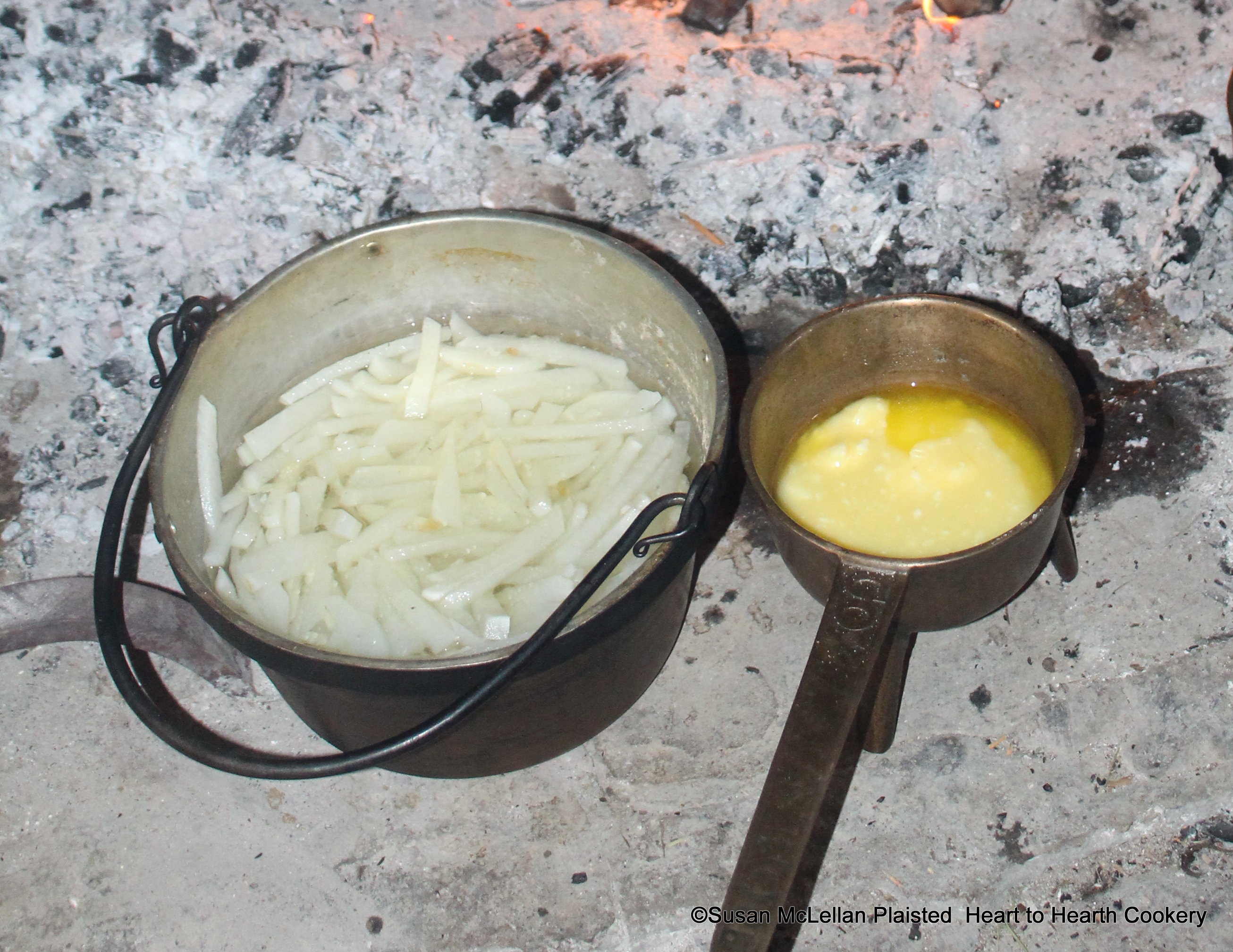 In the brass posnet, the butter is melting with a little Sugar, ready to be added to the strained, boiled strips of turnip and shaken together for the Dutch receipt (recipe), To stew Turnips in another manner.