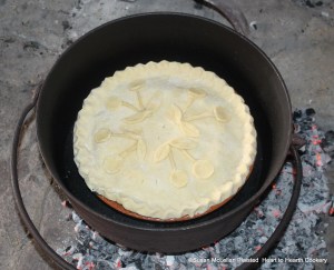 After the crushed Rusks, Sugar and Cinnamon have been placed in the dough with the Cherries for the Dutch receipt (recipe), Cherry-taert in another manner, then add little pieces of Butter on top, cover with a lid of Dough in which there are here and there only small holes. The taert is in my original bake kettle for baking.