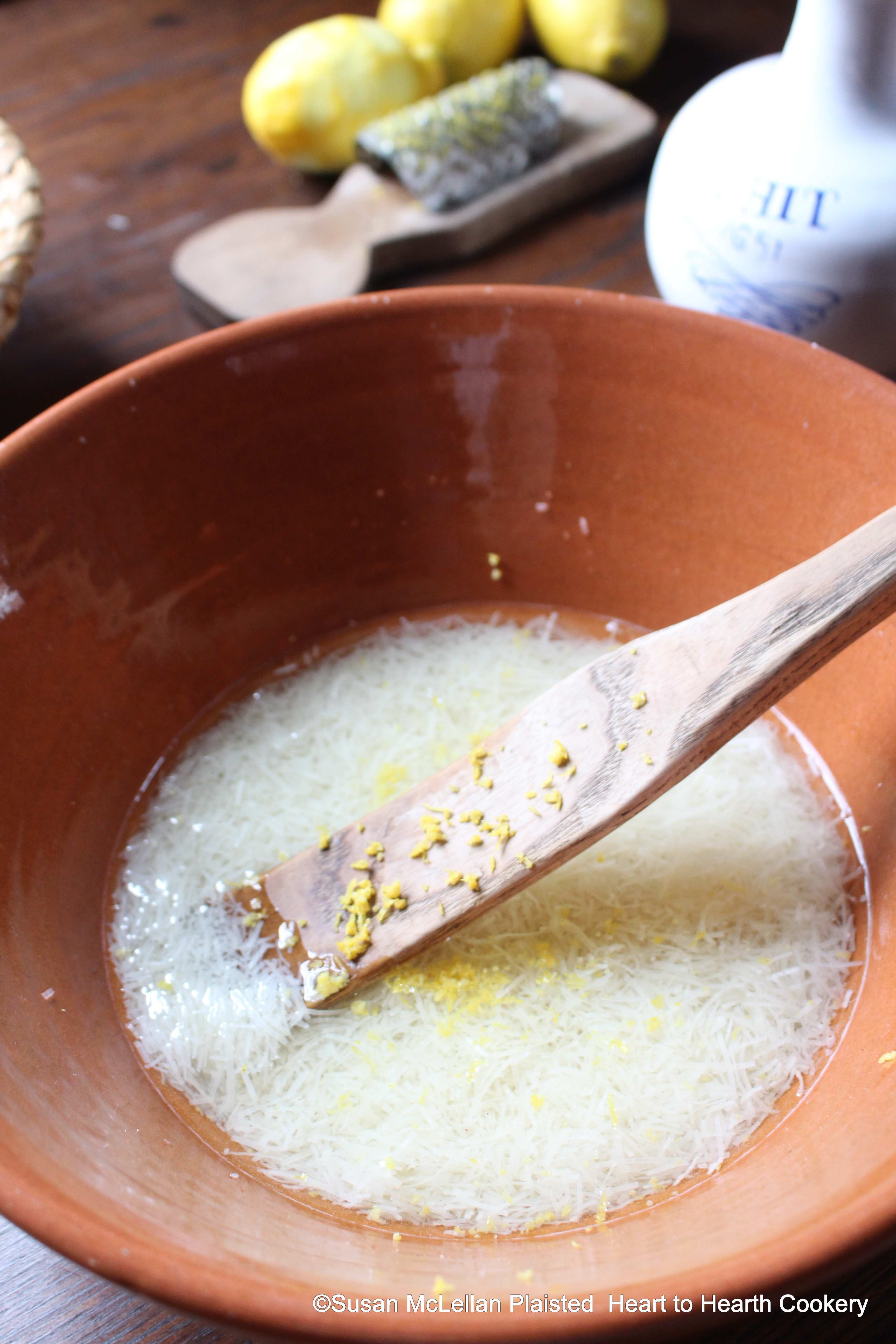 After the beaten isinglass is covered with white wine for the receipt (recipe), Yellow Flummery, the rind of one lemon, the juice of two lemons are added.
