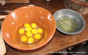 After the flour, currants, raisins, finely beat blanched almonds, rosewater, butter, cream, ale-yeast, saffron steeped in sack are mixed together for the receipt (recipe), To make an excellent Plum Cake, ten or twelve Eggs, but half of the whites of them are added to the batter. Based on the consistency of the batter, I add five whole eggs and five yolks. The saved egg whites were used to ice the cake.