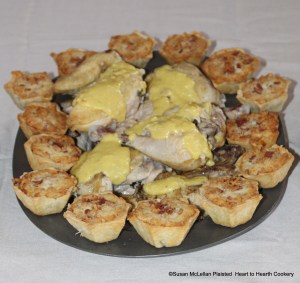 The receipt (recipe), To hash Chickens, is presented to table with the receipt, Petit Patez (Little Pies). The quartered chicken was boiled with salt, pepper, parsley and white wine and served with a sauce of egg yolks, nutmeg, vinegar and mushroom ketchup.