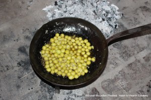 The gooseberries for the receipt (recipe), To make a Gooseberry Tansey, were fried in butter ’til they are sufficiently coddled. To coddle is to heat just below the boiling point and it was common to coddle fruit.