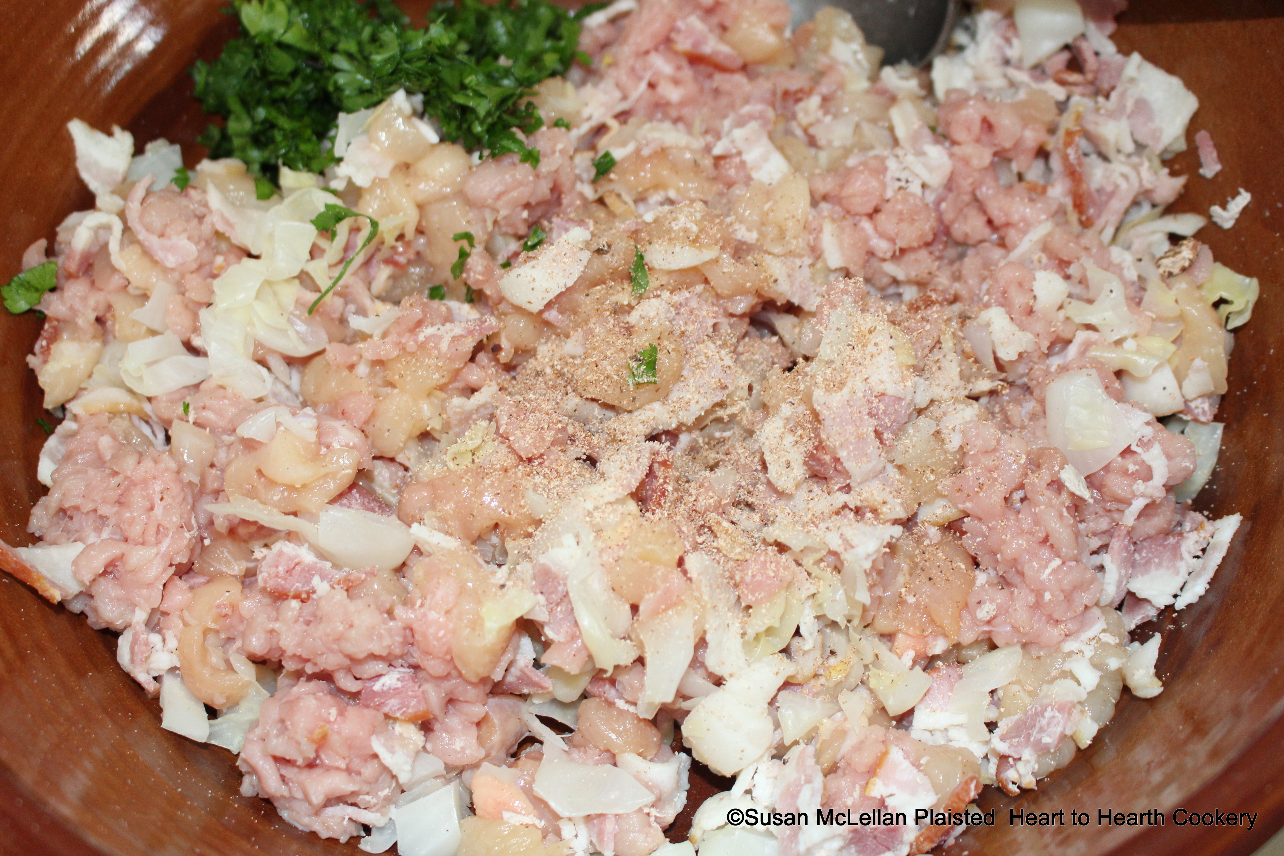 After the cabbage has been well scalded for the receipt (recipe), The Manner of Dressing a farc’d Cabbage for a Side-Dish, prepare your Cabbage to be stuff’d with this Farce made of Flesh of Fowl, a piece of Veal, some parboil’d Bacon, Parsly and a clove of Garlick…all well minc’d.