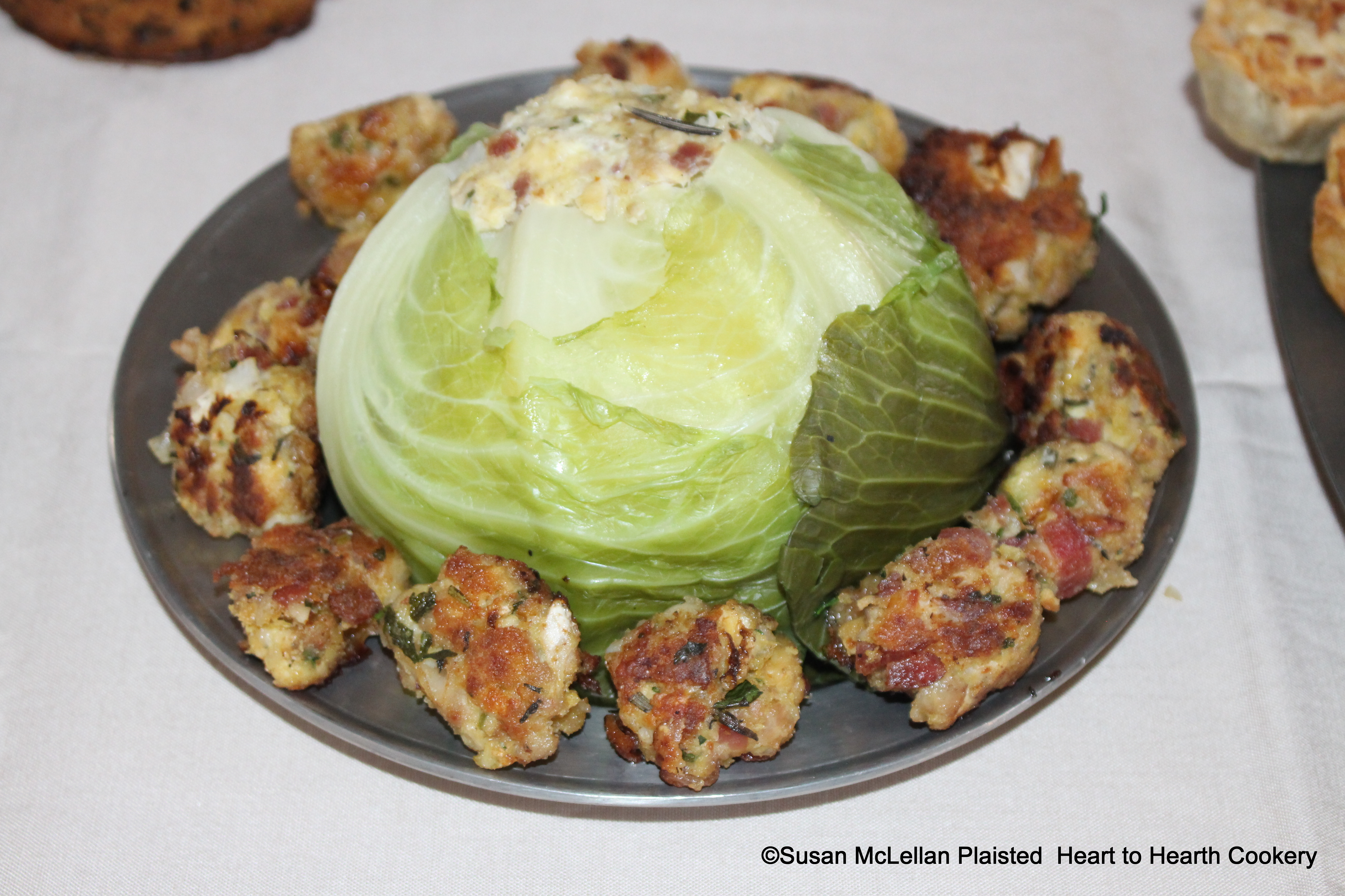 Take a good Cabbage; cut off the Stalk, with a little of the Body, and let it be well scalded. Take it out of the Water and prepare your Cabbage to be stuff’d with this Farce made of Flesh of Fowl, a piece of Veal, some parboil’d Bacon, Parsly and a clove of Garlick; the whole mixture being season’d with fine Herbs and Spice, with some Bread-crum, two whole Eggs, and two or three Yolks, all well minc’d. Your Cabbage being stuff’d with this Farce, let it be clos’d, neatly tied up and put into a Pot or Stew-pan. The Court and Country Cook, 1702