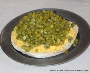 For the receipt (recipe), Asparagus and Eggs, take a Toast…as big as you would have it for your Dish…: Take six eggs beat them well with a good Piece of Butter, a little Salt, then pour them over the Toast, boil some Grass (asparagus) tender, cut it small, and lay it over the Eggs. This makes a pretty side dish.