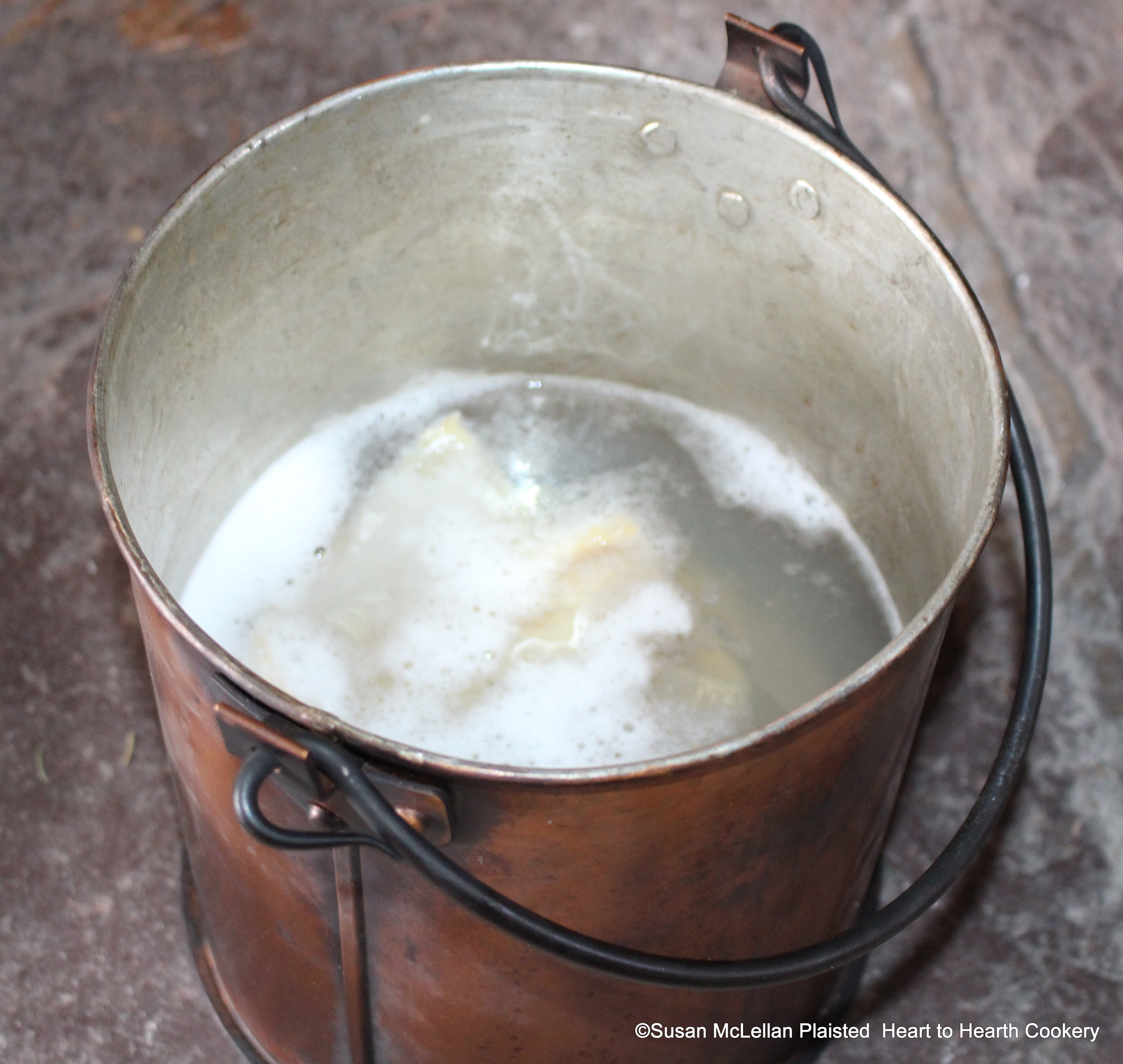 After the loose salt from the Cod has been rinsed off and the fish soaked for a day while changing water for the receipt (recipe), Salt Cod with Parsnips, put the fish in a kettle and cover with fresh water and bring to a gentle boil.