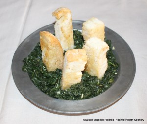 The spinach for the Dutch manuscript receipt (recipe), Spinach with Soldiers, is seasoned with plenty of Butter, Salt, Pepper, Nutmeg, Mace and Garlic to taste then served with strips of fried Bread standing up in the Spinach like Soldiers in a green meadow.