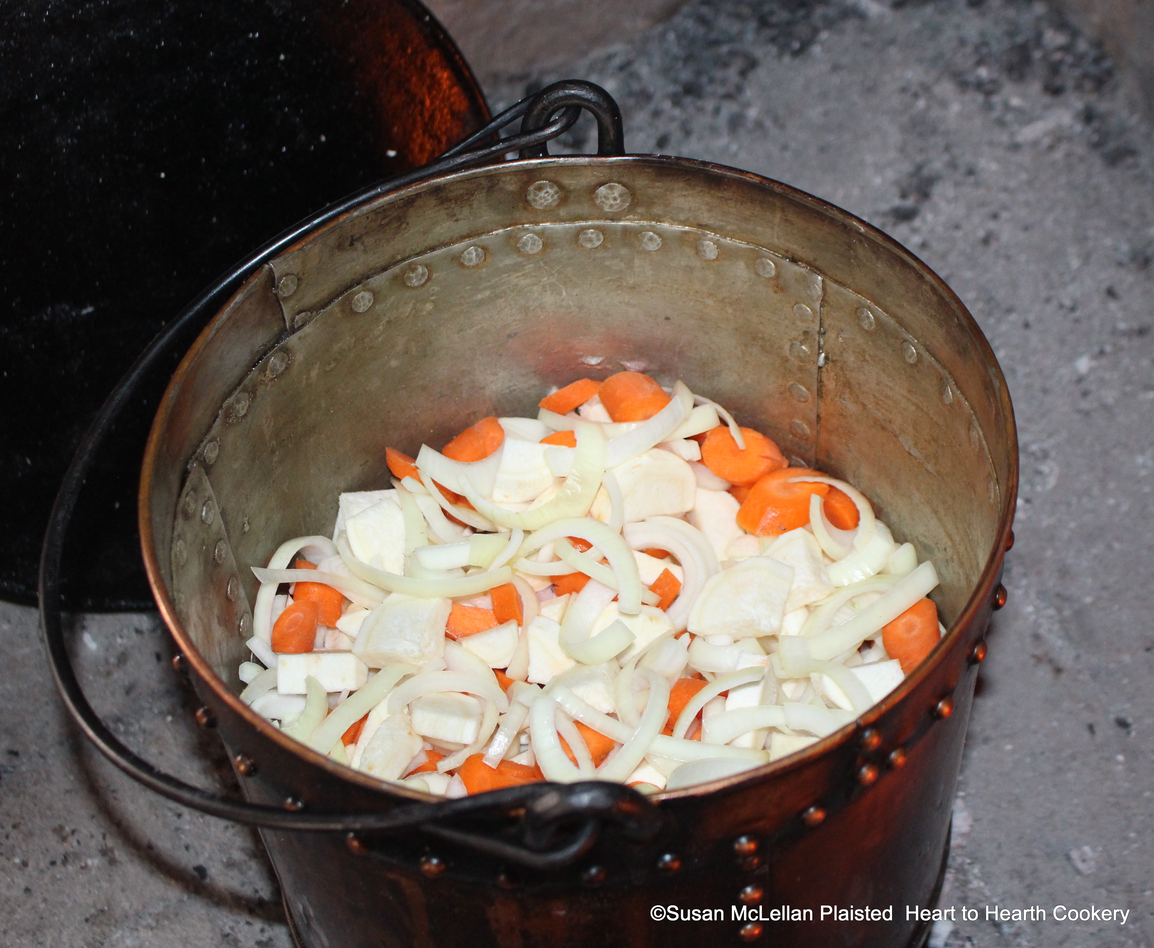 After the lean slices of ham have been beat well for the receipt (recipe), To make an Essence of Ham, lay them in the Bottom of a Stew-pan, with Slices of Carrots, Parsnips and Onions: cover your Pan, and set it over a gentle Fire.
