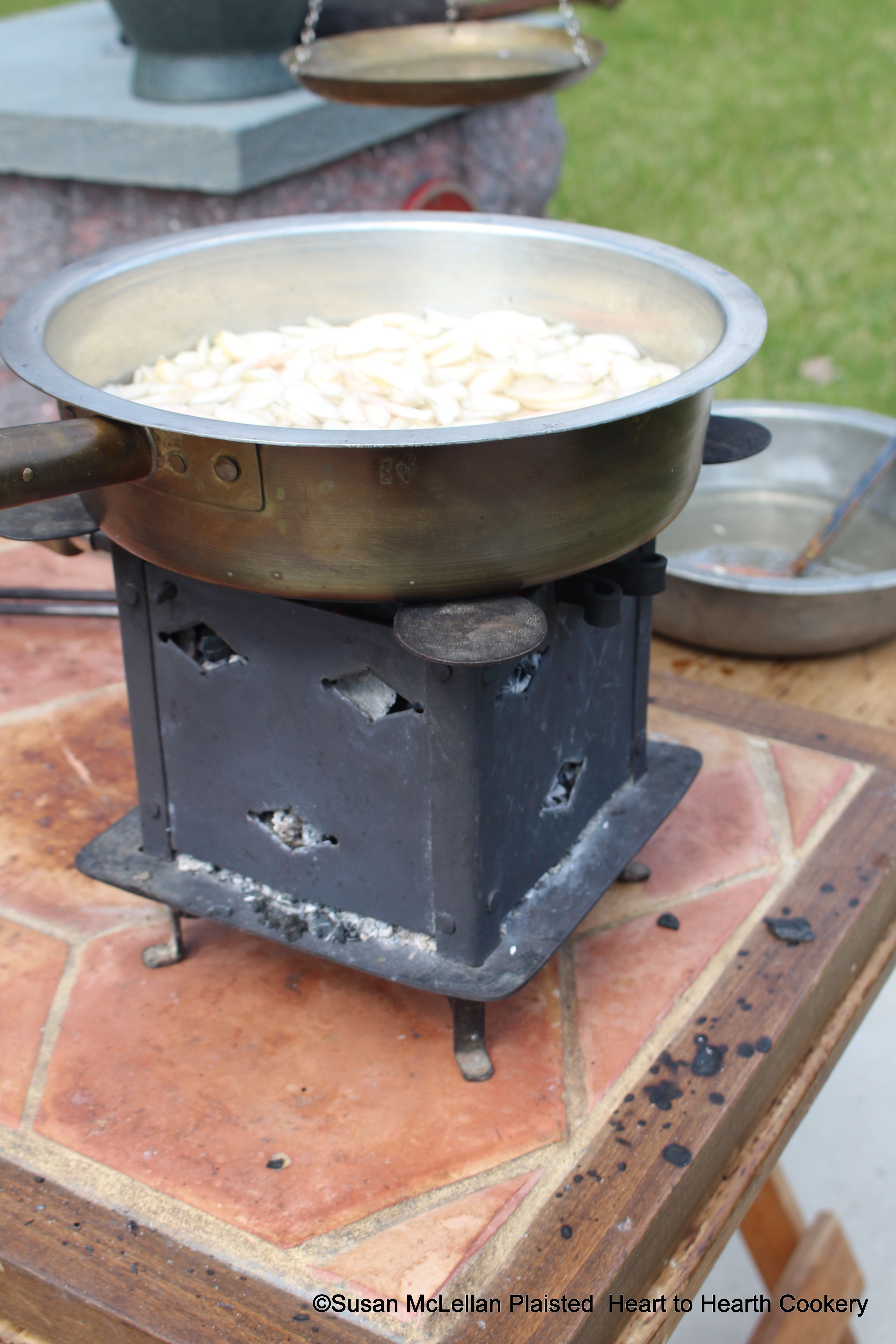 After the apples have been pared and sliced very think for the receipt (recipe), Past of Oringes: My Lady Howe’s Receipt, then put them into a skillet with a little fayre water, set it one (on) the fire and keep it boyling, and stirring, till it be very soft. For fire, I am using my brazier filled with hard wood charcoal at home during the pandemic.