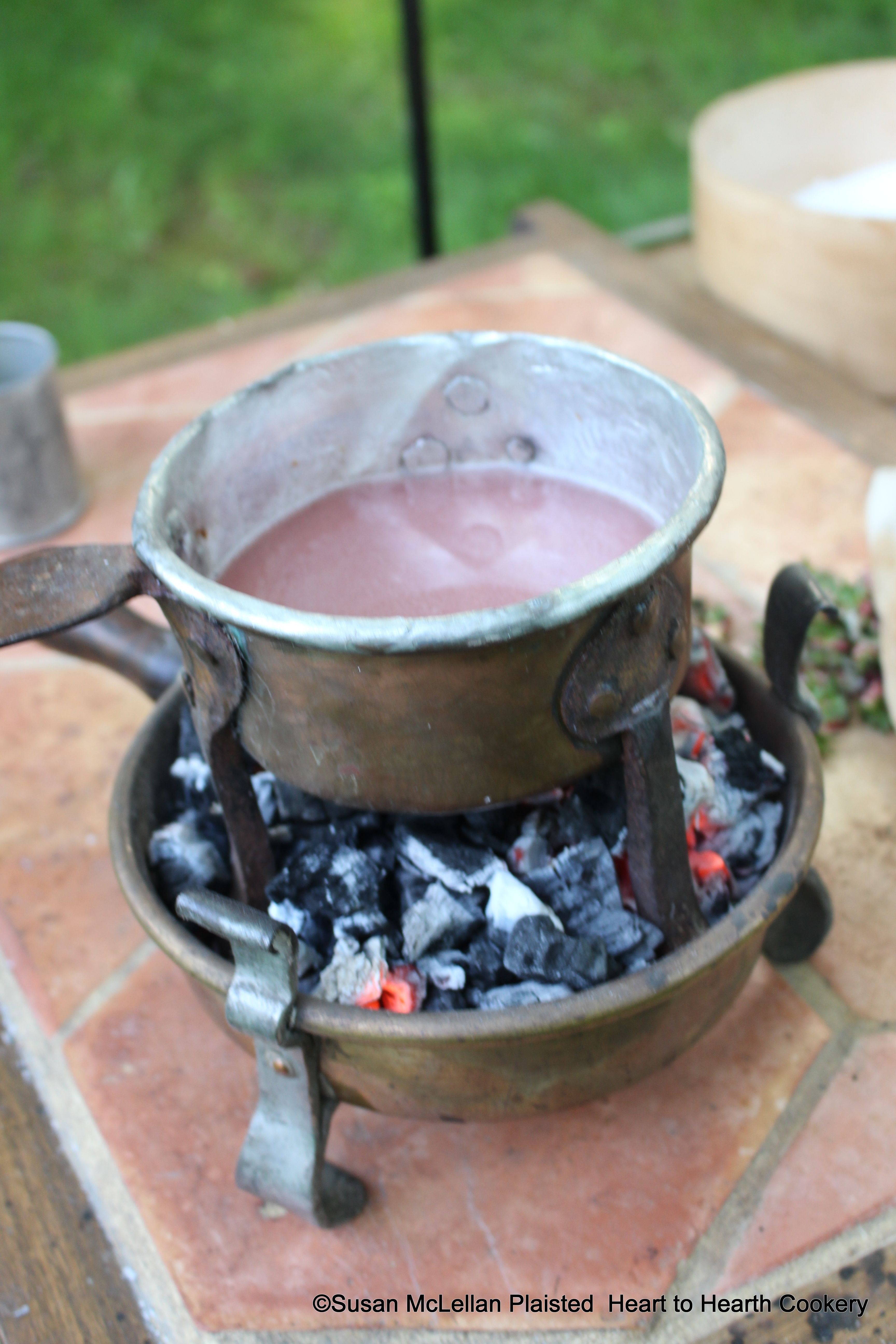 After the juice from a quart of strawberries is mixed with water and sugar for the receipt (recipe) For preserving Strawberries put it into a sauce pan and scald. I am using a small sauce pan on a chafing dish of embers.